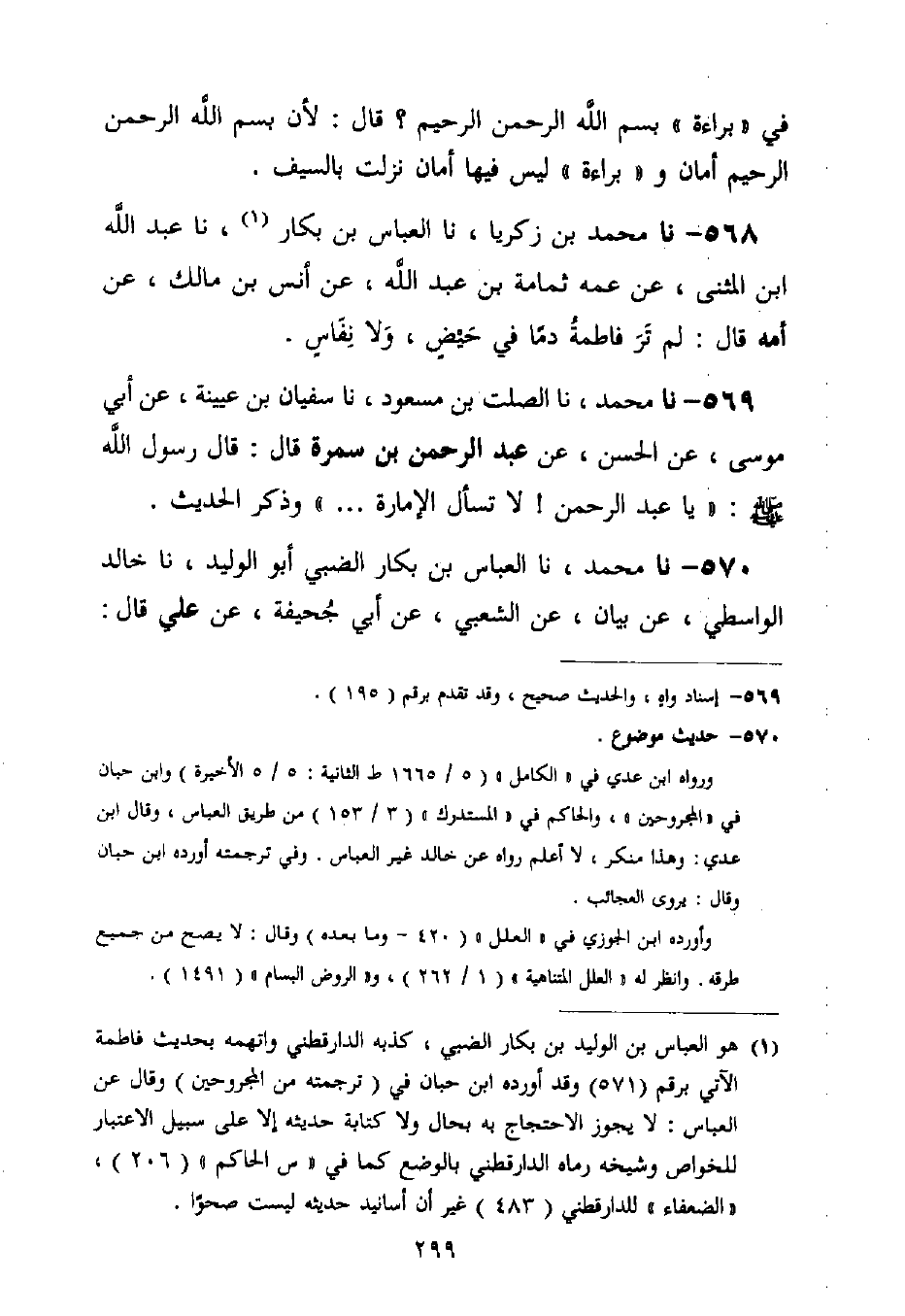 568 - نا مُحَمَّدُ بْنُ زَكَرِيَّا، نا الْعَبَّاسُ بْنُ بَكَّارٍ، نا عَبْدُ اللَّهِ بْنُ الْمُثَنَّى، عَنْ عَمِّهِ ثُمَامَةَ بْنِ عَبْدِ اللَّهِ، عَنْ أَنَسِ بْنِ مَالِكٍ، عَنْ أُمِّهِ قَالَ: §لَمْ تَرَ فَاطِمَةُ دَمًا فِي حَيْضٍ وَلَا نِفَاسٍ