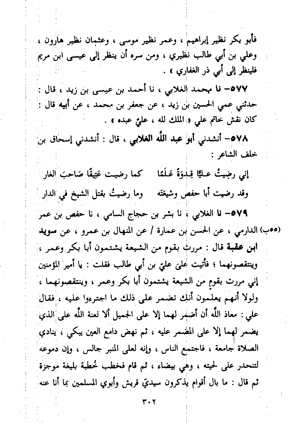 579 - نا الْغَلَابِيُّ، نا بِشْرُ بْنُ حَجَّاجٍ السَّامِيُّ، نا حَفْصُ بْنُ عُمَرَ الدَّارِمِيُّ، عَنِ الْحَسَنِ بْنِ عُمَارَةَ، عَنِ الْمِنْهَالِ بْنِ عَمْرٍو، عَنْ سُوَيْدِ بْنِ غَفَلَةَ قَالَ: مَرَرْتُ بِقَوْمٍ مِنَ الشِّيعَةِ يَشْتُمُونَ أَبَا بَكْرٍ وَعُمَرَ، وَيَنْتَقِصُونَهُمَا، فَأَتَيْتُ عَلَى عَلِيِّ بْنِ أَبِي طَالِبٍ فَقُلْتُ: يَا أَمِيرَ الْمُؤْمِنِينَ إِنِّي مَرَرْتُ بِقَوْمٍ مِنَ الشِّيعَةِ يَشْتُمُونَ أَبَا بَكْرٍ وَعُمَرَ، وَيَنْتَقِصُونَهُمَا، وَلَوْلَا أَنَّهُمْ يَعْلَمُونَ أَنَّكَ تُضْمِرُ عَلَى ذَلِكَ مَا اجْتَرَءُوا عَلَيْهِ، فَقَالَ عَلِيٌّ: «مُعَاذَ اللَّهِ أَنْ أُضْمِرَ لَهُمَا إِلَّا عَلَى الْجَمِيلِ أَلَا لَعْنَةُ اللَّهِ عَلَى الَّذِي يُضْمِرُ لَهُمَا إِلَّا عَلَى الْمُضَمَرِ عَلَيْهِ»، ثُمَّ نَهَضَ دَامِعَ الْعَيْنِ يَبْكِي، يُنَادِي الصَّلَاةُ جَامِعَةٌ، فَاجْتَمَعَ النَّاسُ، وَإِنَّهُ لَعَلَى الْمِنْبَرِ جَالِسٌ، وَإِنَّ دُمُوعَهُ لَتَنْحَدِرُ عَلَى لِحْيَتِهِ، وَهِيَ بَيْضَاءُ، ثُمَّ قَامَ فَخَطَبَ خُطْبَةً بَلِيغَةً مُوجَزَةً ثُمَّ قَالَ: " §مَا بَالُ أَقْوَامٍ يَذْكُرُونَ سَيِّدَيْ قُرَيْشٍ وَأَبَوَيِ الْمُسْلِمِينَ بِمَا أَنَا عَنْهُ -[303]- مُتَنَزِّهٌ، وَمِمَّا يَقُولُونَ بَرِيءٌ، وَعَلَى مَا يَقُولُونَ مُعَاقِبٌ، فَوَالَّذِي فَلَقَ الْحَبَّةَ، وَبَرَأَ النَّسَمَةَ لَا يُحِبُّهُمَا إِلَّا كُلُّ مُؤْمِنٍ تَقِيٍّ، وَلَا يَبْغَضُهُمَا إِلَّا كُلُّ فَاجِرٍ بَذِيءٍ، أَخَوَا رَسُولِ اللَّهِ صَلَّى اللَّهُ عَلَيْهِ وَسَلَّمَ وَصَاحِبَاهُ وَوَزِيرَاهُ يَأْمُرَانِ وَيَنْهَيَانِ فَمَا يُغَادِرَانِ فِيمَا يَصْنَعَانِ رَأْيَ رَسُولِ اللَّهِ صَلَّى اللَّهُ عَلَيْهِ وَسَلَّمَ لَا يَرَى كَرَأْيِهِمْ رَأْيًا، وَلَا يُحِبُّ كَحُبِّهِمَا حُبًّا، فَقُبِضَ رَسُولُ اللَّهِ صَلَّى اللَّهُ عَلَيْهِ وَسَلَّمَ وَهُوَ عَنْهُمَا رَاضٍ، وَوَلَّى أَبَا بَكْرٍ الصَّلَاةَ فَصَلَّى بِنَا أَيَّامًا عَلَى عَهْدِ رَسُولِ اللَّهِ صَلَّى اللَّهُ عَلَيْهِ وَسَلَّمَ فَلَمَّا قُبِضَ رَسُولُ اللَّهِ صَلَّى اللَّهُ عَلَيْهِ وَسَلَّمَ، وَلَّاهُ الْمُسْلِمُونَ الزَّكَاةَ، وَلِيَهُمَا لِأَنَّهُمَا مَقْرُونَتَانِ فِي كِتَابِ اللَّهِ تَعَالَى، فَكُنْتُ أَوَّلَ. . . مِنْ بَنِي عَبْدِ الْمُطَّلِبِ وَهُوَ لِذَلِكَ كَارِهٌ يَوَدُّ لَوْ أَنَّ بَعْضَنَا كَفَاهُ فَكَانَ وَاللَّهِ خَيْرَ مَنْ بَقِيَ أَرْأَفَهُ رَأْفَةً، وَأَرْحَمَهُ رَحْمَةً، وَأَنْفَسَهُ وَرَعًا شَبَّهَهُ رَسُولُ اللَّهِ صَلَّى اللَّهُ عَلَيْهِ وَسَلَّمَ بِمِيكَائِيلَ رَأْفَةً وَرَحْمَةً، وَبِإِبْرَاهِيمَ عَفْوًا وَوَقَارًا، فَسَارَ فِينَا بِسِيرَةِ رَسُولِ اللَّهِ صَلَّى اللَّهُ عَلَيْهِ وَسَلَّمَ فَلَمَّا قَبَضَهُ اللَّهُ جَلَّ وَعَزَّ صُيِّرَ الْأَمْرُ إِلَى عُمَرَ فَمِنَ الْمُسْلِمِينَ مَنْ رَضِيَ، وَمِنْهُمْ مَنْ سَخَطَ فَكُنْتُ مِمَّنْ رَضِيَ، فَوَاللَّهِ مَا فَارَقَ عُمَرُ الدُّنْيَا حَتَّى رَضِيَ بِهِ مَنْ سَخَطَهُ فَأَعَزَّ اللَّهُ بِإِسْلَامِهِ الْإِسْلَامَ وَجَعَلَ هِجْرَتَهُ لِلدَّيْنِ قِوَامًا، وَضَرَبَ اللَّهُ بِالْحَقِّ عَلَى لِسَانِهِ حَتَّى ظَنَنَّا أَنْ يَنْطِقَ عَنْ لِسَانِهِ، وَقَذَفَ اللَّهُ فِي قُلُوبِ الْمُؤْمِنِينَ الْحُبَّ لَهُ، وَفِي قُلُوبِ الْمُنَافِقِينَ الرَّهْبَةَ مِنْهُ، شَبَّهَهُ رَسُولُ اللَّهِ صَلَّى اللَّهُ عَلَيْهِ وَسَلَّمَ بِجِبْرِيلَ فَظًّا غَلِيظًا، وَبِنُوحٍ حَنِقًا مُغْتَاظًا عَلَى الْأَعْدَاءِ، فَمَنْ لَكُمْ بِمِثْلِهِمَا، رَحْمَةُ اللَّهِ عَلَيْهِمَا، لَا يُبْلَغُ مَبْلَغُهُمَا إِلَّا بِالْحُبِّ لَهُمَا، وَاتِّبَاعِ آثَارِهِمَا، وَلَوْ كُنْ