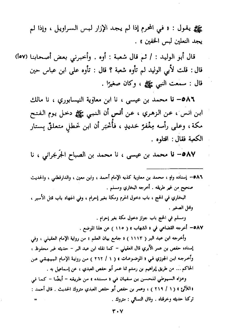 586 - نا مُحَمَّدُ بْنُ عِيسَى، نا ابْنُ مُعَاوِيَةَ النَّيْسَابُورِيُّ، نا مَالِكُ بْنُ أَنَسٍ، عَنِ الزُّهْرِيِّ، عَنْ أَنَسٍ، أَنَّ النَّبِيَّ صَلَّى اللَّهُ عَلَيْهِ وَسَلَّمَ §دَخَلَ يَوْمَ الْفَتْحِ مَكَّةَ، وَعَلَى رَأْسِهِ مِغْفَرٌ حَدِيدٌ، فَأُخْبِرَ أَنَّ ابْنَ خَطَلٍ مُتَعَلِّقٌ بِسِتَارِ الْكَعْبَةِ فَقَالَ: «اقْتُلُوهُ»