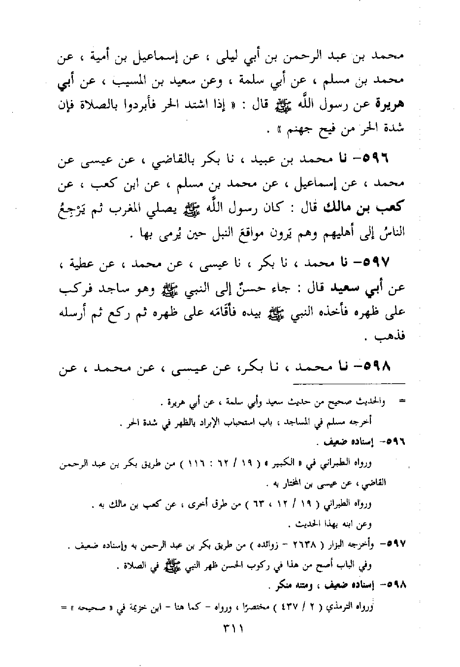 597 - نا مُحَمَّدٌ، نا بَكْرٌ، نا عِيسَى، عَنْ مُحَمَّدٍ، عَنْ عَطِيَّةَ، عَنْ أَبِي سَعِيدٍ قَالَ: §جَاءَ حَسَنٌ إِلَى النَّبِيِّ صَلَّى اللَّهُ عَلَيْهِ وَسَلَّمَ وَهُوَ سَاجِدٌ فَرَكِبَ عَلَى ظَهْرِهِ فَأَخَذَهُ النَّبِيُّ صَلَّى اللَّهُ عَلَيْهِ وَسَلَّمَ بِيَدِهِ فَأَقَامَهُ عَلَى ظَهْرِهِ ثُمَّ رَكَعَ، ثُمَّ أَرْسَلَهُ فَذَهَبَ