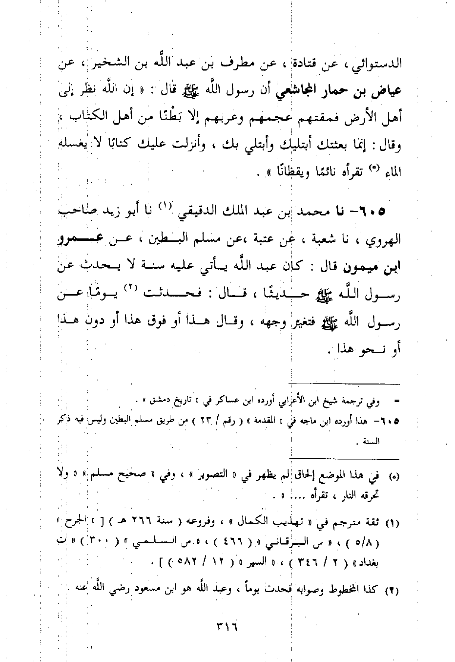 605 - نا مُحَمَّدُ بْنُ عَبْدِ الْمَلِكِ الدَّقِيقِيُّ، نا أَبُو زَيْدٍ صَاحِبُ الْهَرَوِيِّ، نا شُعْبَةُ، عَنْ عُتْبَةَ، عَنْ مُسْلِمٍ الْبَطِينِ، عَنْ عَمْرِو بْنِ مَيْمُونٍ قَالَ: كَانَ عَبْدُ اللَّهِ يَأْتِي عَلَيْهِ سَنَةٌ لَا يُحَدِّثُ عَنْ رَسُولِ اللَّهِ صَلَّى اللَّهُ عَلَيْهِ وَسَلَّمَ حَدِيثًا قَالَ: فَحَدَّثَ يَوْمًا عَنْ رَسُولِ اللَّهِ صَلَّى اللَّهُ عَلَيْهِ وَسَلَّمَ §فَتَغَيَّرَ وَجْهُهُ، وَقَالَ: «هَذَا أَوْ فَوْقَ هَذَا أَوْ دُونَ هَذَا أَوْ نَحْوَ هَذَا»