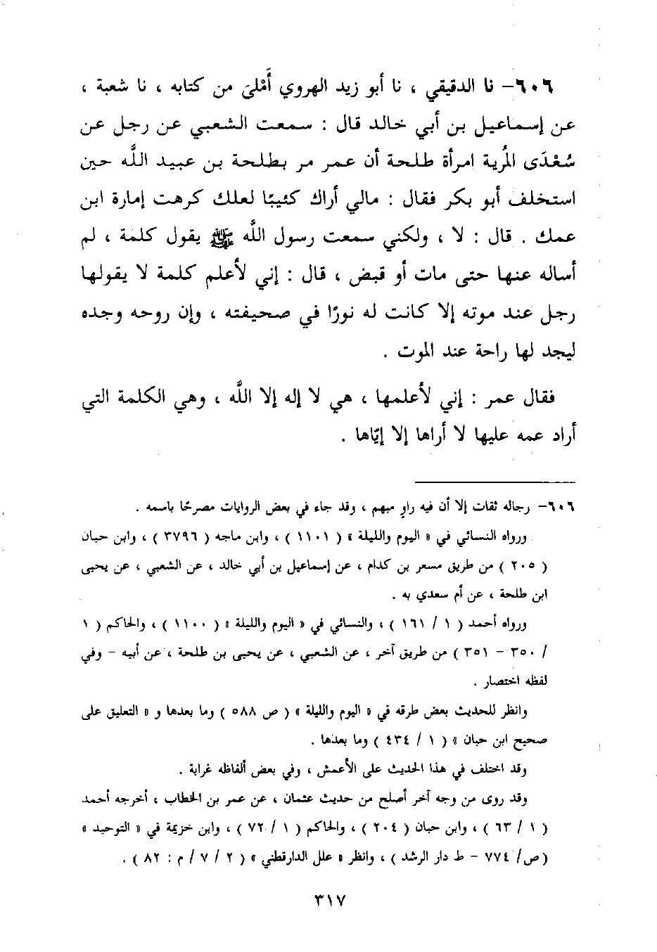 606 - نا الدَّقِيقِيُّ، نا أَبُو زَيْدٍ الْهَرَوِيُّ، أَمْلَى مِنْ كِتَابِهِ، نا شُعْبَةُ، عَنْ إِسْمَاعِيلَ بْنِ أَبِي خَالِدٍ قَالَ: سَمِعْتُ الشَّعْبِيَّ، عَنْ رَجُلٍ، عَنْ سُعْدَى الْمُرِّيَّةِ امْرَأَةِ طَلْحَةَ أَنَّ عُمَرَ، مَرَّ بِطَلْحَةَ بْنِ عُبَيْدِ اللَّهِ حِينَ اسْتُخْلِفَ أَبُو بَكْرٍ فَقَالَ: مَا لِي أَرَاكَ كَئِيبًا لَعَلَّكَ كَرِهْتَ إِمَارَةَ ابْنِ عَمِّكَ قَالَ: لَا، وَلَكِنِّي سَمِعْتُ رَسُولَ اللَّهِ صَلَّى اللَّهُ عَلَيْهِ وَسَلَّمَ يَقُولُ كَلِمَةً لَمْ أَسْأَلْهُ عَنْهَا حَتَّى مَاتَ أَوْ قُبِضَ قَالَ: إِنِّي لَأَعْلَمُ §كَلِمَةً لَا يَقُولُهَا رَجُلٌ عِنْدَ مَوْتِهِ إِلَّا كَانَتْ لَهُ نُورًا فِي صَحِيفَتِهِ، وَإِنَّ رُوحَهُ وَجَدَهَا لَيَجِدُ لَهَا رَاحَةً عِنْدَ الْمَوْتِ " فَقَالَ عُمَرُ: إِنِّي لَأَعْلَمُهَا، هِيَ «لَا إِلَهَ إِلَّا اللَّهُ» وَهِيَ الْكَلِمَةُ الَّتِي أَرَادَ عَمَّهَ عَلَيْهَا لَا أَرَاهَا إِلَّا إِيَّاهَا