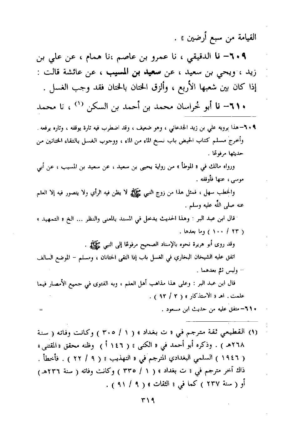 609 - نا الدَّقِيقِيُّ، نا عَمْرُو بْنُ عَاصِمٍ، نا هَمَّامٌ، عَنْ عَلِيِّ بْنِ زَيْدٍ، وَيَحْيَى بْنِ سَعِيدٍ، عَنْ سَعِيدِ بْنِ الْمُسَيِّبِ، عَنْ عَائِشَةَ قَالَتْ: «§إِذَا كَانَ بَيْنَ شُعَبِهَا الْأَرْبَعِ، وَأَلْزَقَ الْخِتَانَ بِالْخِتَانِ فَقَدْ وَجَبَ الْغُسْلُ»