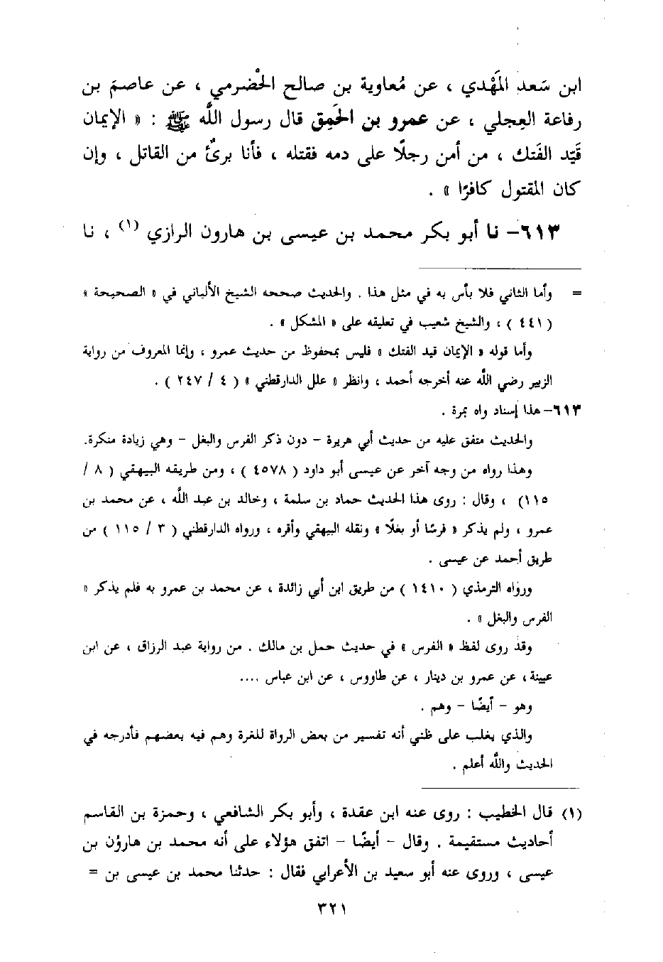 613 - نا أَبُو بَكْرٍ مُحَمَّدُ بْنُ عِيسَى بْنِ هَارُونَ الرَّازِيُّ، نا -[322]- سُلَيْمَانُ الشَّاذَكُونِيُّ، نا عِيسَى بْنُ يُونُسَ، عَنْ مُحَمَّدِ بْنِ عَمْرٍو، عَنْ أَبِي سَلَمَةَ، عَنْ أَبِي هُرَيْرَةَ، أَنَّ النَّبِيَّ صَلَّى اللَّهُ عَلَيْهِ وَسَلَّمَ §قَضَى فِي الْجَنِينِ بِغُرَّةِ عَبْدٍ أَوْ أَمَةٍ أَوْ فَرَسٍ أَوْ بَغْلٍ قَالَ لَنَا سُلَيْمَانُ: مَنْ حَدَّثَكُمْ بِهَذَا الْحَدِيثِ عَنْ عِيسَى غَيْرِي فَلَا تُصَدِّقُوهُ فَقَالَ لَهُ رَجُلٌ: لِمَ؟ قَالَ: لِأَنِّي ضَرَبْتُ عَلَيْهِ مِنْ كِتَابِهِ، وَعَاهَدَنِي أَنْ لَا يُحَدِّثَ بِهِ