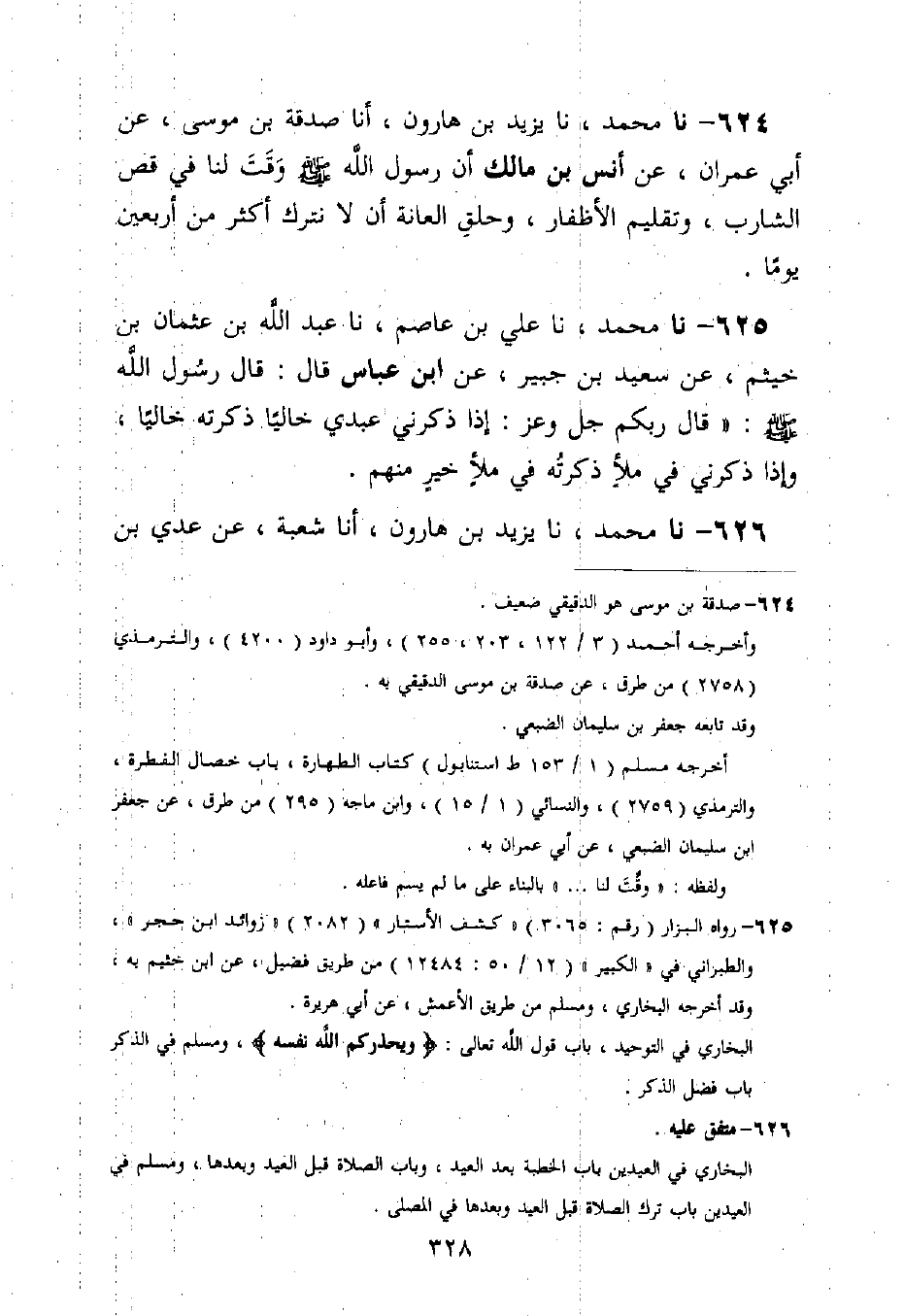 626 - نا مُحَمَّدٌ، نا يَزِيدُ بْنُ هَارُونَ، أنا شُعْبَةُ، عَنْ عَدِيِّ بْنِ -[329]- ثَابِتٍ، عَنْ سَعِيدِ بْنِ جُبَيْرٍ، عَنِ ابْنِ عَبَّاسٍ، أَنَّ النَّبِيَّ صَلَّى اللَّهُ عَلَيْهِ وَسَلَّمَ §خَرَجَ يَوْمَ الْعِيدِ إِلَى الْمُصَلَّى، فَلَمْ يُصَلِّ قَبْلَ الصَّلَاةِ وَلَا بَعْدَهَا "