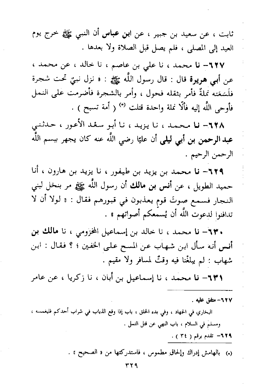 627 - نا مُحَمَّدٌ، نا عَلِيُّ بْنُ عَاصِمٍ، نا خَالِدٌ، عَنْ مُحَمَّدٍ، عَنْ أَبِي هُرَيْرَةَ قَالَ: قَالَ رَسُولُ اللَّهِ صَلَّى اللَّهُ عَلَيْهِ وَسَلَّمَ: «نَزَلَ نَبِيٌّ تَحْتَ شَجَرَةٍ فَلَسَعَتْهُ نَمْلَةٌ فَأَمَرَ بِثُقْلِهِ فَحُوِّلَ، وَأَمَرَ بِالشَّجَرَةِ فَأُضْرِمَتْ عَلَى النَّمْلِ فَأَوْحَى اللَّهُ إِلَيْهِ §فَأَلَّا نَمْلَةً وَاحِدَةً، قَتَلْتَ أُمَّةً تُسَبِّحُ»