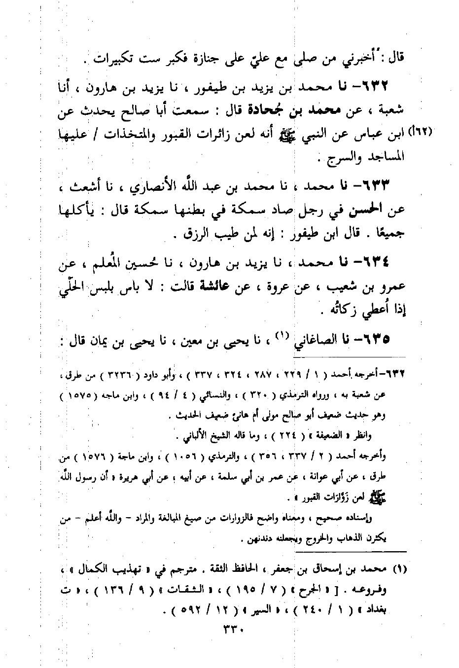632 - نا مُحَمَّدُ بْنُ يَزِيدَ بْنِ طَيْفُورٍ، نا يَزِيدُ بْنُ هَارُونَ، أنا شُعْبَةُ، عَنْ مُحَمَّدِ بْنِ جُحَادَةَ قَالَ: سَمِعْتُ أَبَا صَالِحٍ يُحَدِّثُ عَنِ ابْنِ عَبَّاسٍ، عَنِ النَّبِيِّ صَلَّى اللَّهُ عَلَيْهِ وَسَلَّمَ أَنَّهُ §لَعَنَ زَائِرَاتِ الْقُبُورِ وَالْمُتَّخِذَاتِ عَلَيْهَا الْمَسَاجِدَ وَالسُّرُجَ "