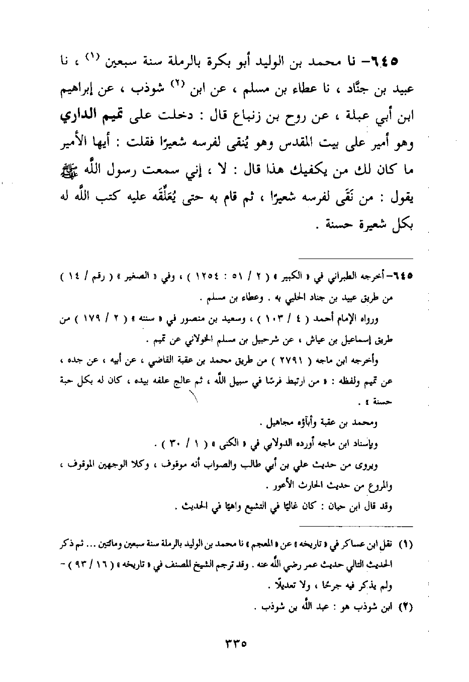 645 - نا مُحَمَّدُ بْنُ الْوَلِيدِ أَبُو بَكْرَةَ بِالرَّمْلَةِ سَنَةَ سَبْعِينَ، نا عُبَيْدُ بْنُ جُنَادٍ، نا عَطَاءُ بْنُ مُسْلِمٍ، عَنِ ابْنِ شَوْذَبٍ، عَنْ إِبْرَاهِيمَ بْنِ أَبِي عَبْلَةَ، عَنْ رَوْحِ بْنِ زِنْبَاعٍ قَالَ: دَخَلْتُ عَلَى تَمِيمٍ الدَّارِيِّ وَهُوَ أَمِيرٌ عَلَى بَيْتِ الْمَقْدِسِ وَهُوَ يُنَقِّي لِفَرَسِهِ شَعِيرًا فَقُلْتُ: أَيُّهَا الْأَمِيرُ مَا كَانَ لَكَ مَنْ يَكْفِيكَ هَذَا؟ قَالَ: لَا، إِنِّي سَمِعْتُ رَسُولَ اللَّهِ صَلَّى اللَّهُ عَلَيْهِ وَسَلَّمَ يَقُولُ: «§مَنْ نَقَّى لِفَرَسِهِ شَعِيرًا، ثُمَّ قَامَ بِهِ حَتَّى يُعَلِّقَهُ عَلَيْهِ كَتَبَ اللَّهُ لَهُ بِكُلِّ شَعِيرَةٍ حَسَنَةً»