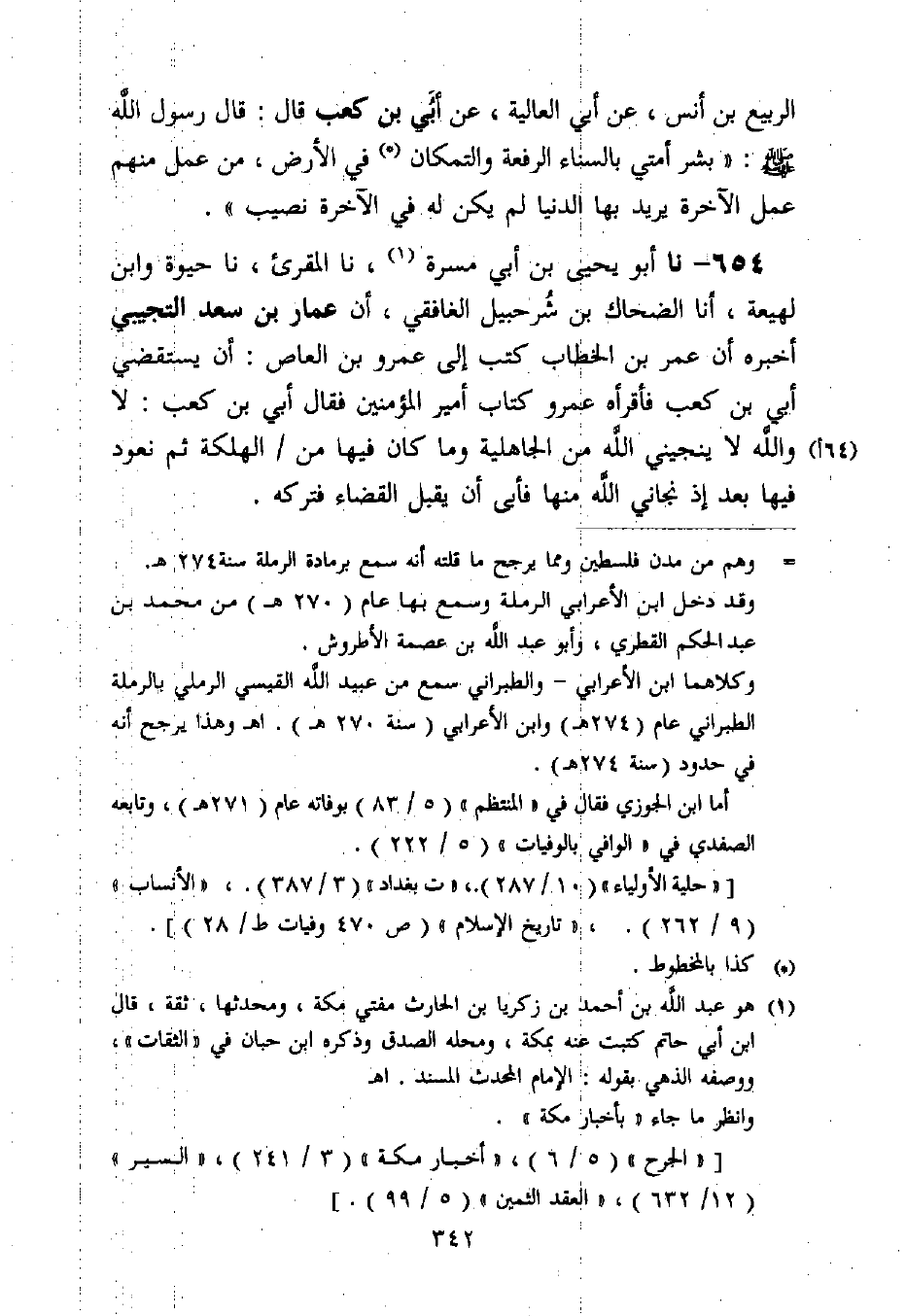 654 - نا أَبُو يَحْيَى بْنُ أَبِي مَسَرَّةَ، نا الْمُقْرِئُ، نا حَيْوَةُ، وَابْنُ لَهِيعَةَ، أنا الضَّحَّاكُ بْنُ شُرَحْبِيلَ الْغَافِقِيُّ، أَنَّ عَمَّارَ بْنَ سَعْدٍ التُّجِيبِيَّ، أَخْبَرَهُ أَنَّ عُمَرَ بْنَ الْخَطَّابِ كَتَبَ إِلَى عَمْرِو بْنِ الْعَاصِ: أَنْ يَسْتَقْضِيَ أُبَيَّ بْنَ كَعْبٍ فَأَقْرَأَهُ عَمْرٌو كِتَابَ أَمِيرِ الْمُؤْمِنِينَ فَقَالَ أُبَيُّ بْنُ كَعْبٍ: «لَا وَاللَّهِ §لَا يُنَجِّينِي اللَّهُ مِنَ الْجَاهِلِيَّةِ وَمَا كَانَ فِيهَا مِنَ الْهَلَكَةِ ثُمَّ نَعُودُ فِيهَا بَعْدَ إِذْ نَجَّانِي اللَّهُ مِنْهَا» فَأَبَى أَنْ يَقْبَلَ الْقَضَاءَ فَتَرَكَهُ