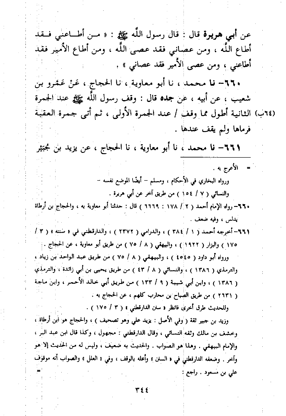 660 - نا مُحَمَّدٌ، نا أَبُو مُعَاوِيَةَ، نا الْحَجَّاجُ، عَنْ عَمْرِو بْنِ شُعَيْبٍ، عَنْ أَبِيهِ، عَنْ جَدِّهِ قَالَ: «§وَقَفَ رَسُولُ اللَّهِ صَلَّى اللَّهُ عَلَيْهِ وَسَلَّمَ عِنْدَ الْجَمْرَةِ الثَّانِيَةِ أَطْوَلَ مِمَّا وَقَفَ عِنْدَ الْجَمْرَةِ الْأُولَى، ثُمَّ أَتَى جَمْرَةَ الْعَقَبَةِ فَرَمَاهَا وَلَمْ يَقِفْ عِنْدَهَا»