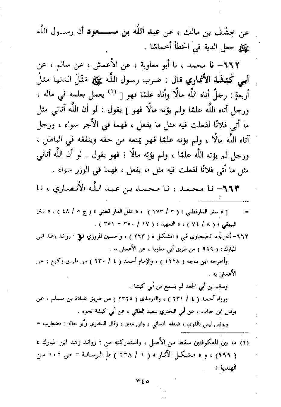 662 - نا مُحَمَّدٌ، نا أَبُو مُعَاوِيَةَ، عَنِ الْأَعْمَشِ، عَنْ سَالِمٍ، عَنْ أَبِي كَبْشَةَ الْأَنْمَارِيِّ قَالَ: ضَرَبَ رَسُولُ اللَّهِ صَلَّى اللَّهُ عَلَيْهِ وَسَلَّمَ §مَثَلَ الدُّنْيَا مَثَلَ أَرْبَعَةٍ: رَجُلٌ آتَاهُ اللَّهُ مَالًا وَآتَاهُ عِلْمًا فَهُوَ يَعْمَلُ بِعِلْمِهِ فِي مَالِهِ، وَرَجُلٌ آتَاهُ اللَّهُ عِلْمًا وَلَمْ يُؤْتِهِ مَالًا فَهُوَ يَقُولُ: لَوْ أَنَّ اللَّهَ آتَانِي مِثْلَ مَا آتَى فُلَانًا لَفَعَلْتُ فِيهِ مِثْلَ مَا يَفْعَلُ، فَهُمَا فِي الْأَجْرِ سَوَاءٌ، وَرَجُلٌ آتَاهُ اللَّهُ مَالًا، وَلَمْ يُؤْتِهِ اللَّهُ عِلْمًا فَهُوَ يَمْنَعُهُ مِنْ حَقِّهِ وَيُنْفِقُهُ فِي الْبَاطِلِ، وَرَجُلٌ لَمْ يُؤْتِهِ اللَّهُ عِلْمًا وَلَمْ يُؤْتِهِ مَالًا، فَهُوَ يَقُولُ: لَوْ أَنَّ اللَّهَ آتَانِي مِثْلَ مَا آتَى فُلَانًا لَفَعَلْتُ فِيهِ مِثْلَ مَا يَفْعَلُ، فَهُمَا فِي الْوِزْرِ سَوَاءً "