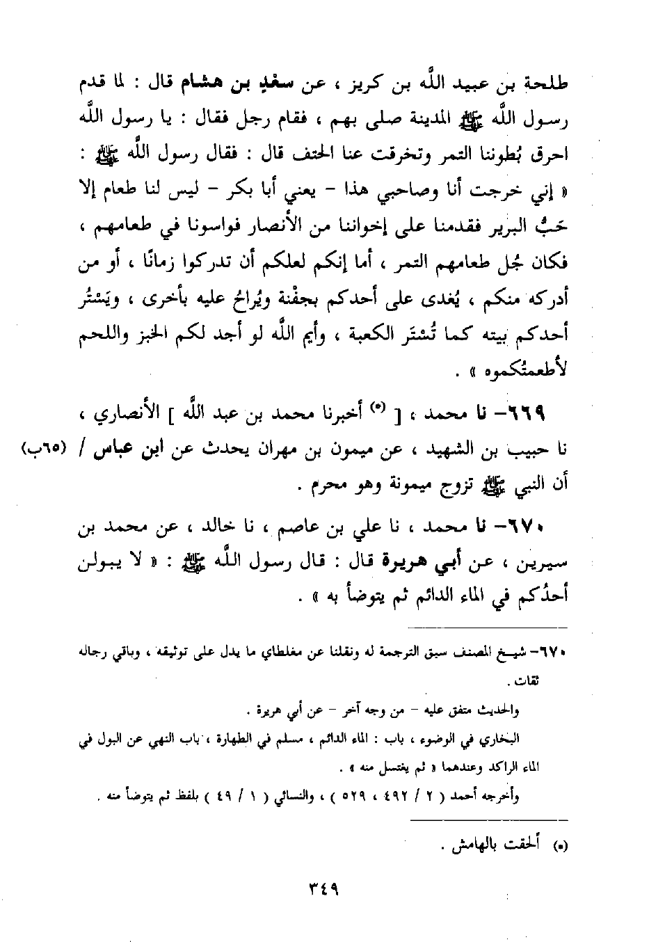 670 - نا مُحَمَّدٌ، نا عَلِيُّ بْنُ عَاصِمٍ، نا خَالِدٌ، عَنْ مُحَمَّدِ بْنِ سِيرِينَ، عَنْ أَبِي هُرَيْرَةَ قَالَ: قَالَ رَسُولُ اللَّهِ صَلَّى اللَّهُ عَلَيْهِ وَسَلَّمَ: «§لَا يَبُولَنَّ أَحَدُكُمْ فِي الْمَاءِ الدَّائِمِ ثُمَّ يَتَوَضَّأْ بِهِ»