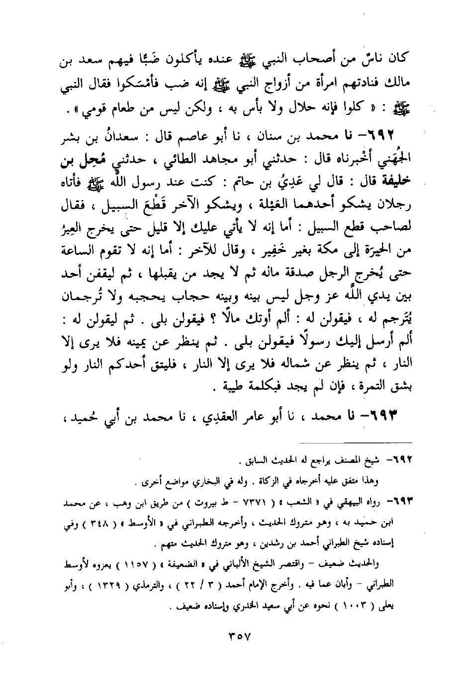 692 - نا مُحَمَّدُ بْنُ سِنَانٍ، نا أَبُو عَاصِمٍ قَالَ: سَعْدَانُ بْنُ بِشْرٍ الْجُهَنِيُّ أَخْبَرَنَاهُ قَالُ: حَدَّثَنِي أَبُو مُجَاهِدٍ الطَّائِيُّ، حَدَّثَنِي مُحِلُّ بْنُ خَلِيفَةَ قَالَ: قَالَ لِي عَدِيُّ بْنُ حَاتِمٍ: كُنْتُ عِنْدَ رَسُولِ اللَّهِ صَلَّى اللَّهُ عَلَيْهِ وَسَلَّمَ فَأَتَاهُ رَجُلَانِ يَشْكُو أَحَدُهُمَا الْعَيْلَةَ، وَيَشْكُو الْآخَرُ قَطْعَ السَّبِيلِ، فَقَالَ لِصَاحِبِ قَطْعِ السَّبِيلِ: «أَمَا إِنَّهُ لَا يَأْتِي عَلَيْكَ إِلَّا قَلِيلٌ حَتَّى §يَخْرُجَ الْعِيرُ مِنَ الْحِيرَةِ إِلَى مَكَّةَ بِغَيْرِ خَفِيرٍ» وَقَالَ لِلْآخَرِ: " أَمَا إِنَّهُ لَا تَقُومُ السَّاعَةُ حَتَّى يُخْرِجَ الرَّجُلُ صَدَقَةَ مَالِهِ ثُمَّ لَا يَجِدُ مَنْ يَقْبَلُهَا، ثُمَّ لَيَقِفَنَّ أَحَدٌ بَيْنَ يَدَيِ اللَّهِ عَزَّ وَجَلَّ لَيْسَ بَيْنَهُ وَبَيْنَهُ حِجَابٌ يَحْجُبُهُ وَلَا تُرْجُمَانٌ يُتَرْجِمُ لَهُ، فَيَقُولَنَّ لَهُ: أَلَمْ أُوتِكَ مَالًا؟ فَيَقُولَنَّ: بَلَى ثُمَّ لَيَقُولَنَّ لَهُ: أَلَمْ أُرْسِلْ إِلَيْكَ رَسُولًا فَيَقُولَنَّ بَلَى، ثُمَّ يَنْظُرُ عَنْ يَمِينِهِ فَلَا يَرَى إِلَّا النَّارَ، ثُمَّ يَنْظُرُ عَنْ شِمَالِهِ فَلَا يَرَى إِلَّا النَّارَ، فَلْيَتَّقِ أَحَدُكُمُ النَّارَ وَلَوْ بِشِقِّ التَّمْرَةِ، فَإِنْ لَمْ يَجِدْ فَبِكَلِمَةٍ طَيِّبَةٍ "