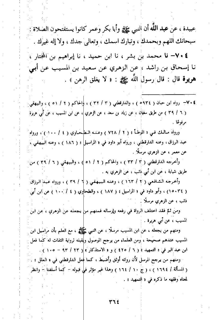 704 - نا مُحَمَّدُ بْنُ بِشْرٍ، نا ابْنُ حُمَيْدٍ، نا إِبْرَاهِيمُ بْنُ الْمُخْتَارِ، نا إِسْحَاقُ بْنُ رَاشِدٍ، عَنِ الزُّهْرِيِّ، عَنْ سَعِيدِ بْنِ الْمُسَيِّبِ، عَنْ أَبِي هُرَيْرَةَ قَالَ: قَالَ رَسُولُ اللَّهِ صَلَّى اللَّهُ عَلَيْهِ وَسَلَّمَ: «§لَا يُغْلَقُ الرَّهْنُ»