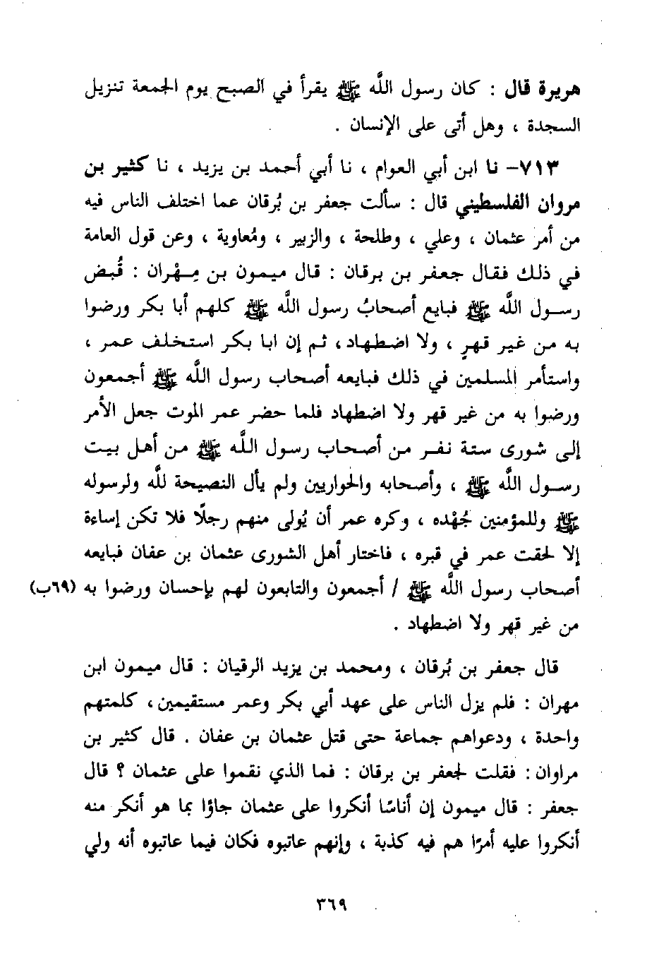713 - نا ابْنُ الْعَوَّامِ، نا أَبِي أَحْمَدُ بْنُ يَزِيدَ، نا كَثِيرُ بْنُ مَرْوَانَ الْفِلَسْطِينِيُّ قَالَ: سَأَلْتُ جَعْفَرَ بْنَ بُرْقَانَ عَمَّا اخْتَلَفَ النَّاسُ فِيهِ مِنْ أَمْرِ عُثْمَانَ، وَعَلِيٍّ، وَطَلْحَةَ، وَالزُّبَيْرِ، وَمُعَاوِيَةَ، وَعَنْ قَوْلِ الْعَامَّةِ فِي ذَلِكَ فَقَالَ جَعْفَرُ بْنُ بُرْقَانَ: قَالَ مَيْمُونُ بْنُ مِهْرَانَ: " §قُبِضَ رَسُولُ اللَّهِ صَلَّى اللَّهُ عَلَيْهِ وَسَلَّمَ فَبَايَعَ أَصْحَابُ رَسُولِ اللَّهِ صَلَّى اللَّهُ عَلَيْهِ وَسَلَّمَ كُلُّهُمْ أَبَا بَكْرٍ وَرَضُوا بِهِ مِنْ غَيْرِ قَهْرٍ، وَلَا اضْطِهَادٍ، ثُمَّ إِنَّ أَبَا بَكْرٍ اسْتَخْلَفَ عُمَرَ، وَاسْتَأْمَرَ الْمُسْلِمِينَ فِي ذَلِكَ فَبَايَعَهُ أَصْحَابُ رَسُولِ اللَّهِ صَلَّى اللَّهُ عَلَيْهِ وَسَلَّمَ أَجْمَعُونَ وَرَضُوا بِهِ مِنْ غَيْرِ قَهْرٍ وَلَا اضْطِهَادٍ، فَلَمَّا حَضَرَ عُمَرَ الْمَوْتُ جَعَلَ الْأَمْرَ إِلَى شُورَى سِتَّةِ نَفَرٍ مِنْ أَصْحَابِ رَسُولِ اللَّهِ صَلَّى اللَّهُ عَلَيْهِ وَسَلَّمَ مِنْ أَهْلِ بَيْتِ رَسُولِ اللَّهِ صَلَّى اللَّهُ عَلَيْهِ وَسَلَّمَ وَأَصْحَابِهِ وَالْحَوَارِيِّينَ وَلَمْ يَأْلُ النَّصِيحَةَ لِلَّهِ وَلِرَسُولِهِ صَلَّى اللَّهُ عَلَيْهِ وَسَلَّمَ وَلِلْمُؤْمِنِينَ جَهَدَهُ، وَكَرِهَ عُمَرُ أَنْ يُوَلِّيَ مِنْهُمْ رَجُلًا فَلَا تَكُنْ إِسَاءَةٌ إِلَّا لَحِقَتْ عُمَرَ فِي قَبْرِهِ، فَاخْتَارَ أَهْلُ الشُّورَى عُثْمَانَ بْنَ عَفَّانَ فَبَايَعَهُ أَصْحَابُ رَسُولِ اللَّهِ صَلَّى اللَّهُ عَلَيْهِ وَسَلَّمَ أَجْمَعُونَ وَالتَّابِعُونَ لَهُمْ بِإِحْسَانٍ وَرَضُوا بِهِ مِنْ غَيْرِ قَهْرٍ وَلَا اضْطِهَادٍ قَالَ جَعْفَرُ بْنُ بُرْقَانَ، وَمُحَمَّدُ بْنُ يَزِيدَ الرَّقِّيَّانِ: قَالَ مَيْمُونُ بْنُ مِهْرَانَ: فَلَمْ يَزَلِ النَّاسُ عَلَى عَهْدِ أَبِي بَكْرٍ وَعُمَرَ مُسْتَقِيمِينَ، كَلِمَتُهُمْ وَاحِدَةٌ، وَدَعْوَاهُمْ جَمَاعَةٌ حَتَّى قُتِلَ عُثْمَانُ بْنُ عَفَّانَ قَالَ كَثِيرُ بْنُ مَرْوَانَ: فَقُلْتُ لِجَعْفَرِ بْنِ بُرْقَانَ: فَمَا الَّذِي نَقَمُوا عَلَى عُثْمَانَ؟ قَالَ جَعْفَرٌ: قَالَ مَيْمُونٌ: إِنَّ أُنَاسًا أَنْكَرُوا عَلَى عُثْمَانَ جَاءُوا بِمَا هُوَ أَنْكَرُ مِنْهُ أَنْكَرُوا عَلَيْهِ أَمْرًا هُمْ فِيهِ كَذَبَةٌ، وَإِنَّهُمْ عَاتَبُوهُ فَكَانَ فِيمَا عَاتَبُوهُ أَنَّهُ وَلَّى -[370]- رِجَالًا مِنْ أَهْلِ بَيْتِهِ فَعَاتَبَهُمْ وَأَرْضَاهُمْ، وَعَزَلَ مَنْ كَرِهُوا وَاسْتَعْمَلَ مَنْ أَرَادُوا ثُمَّ إِنَّ فُسَّاقًا مِنْ أَهْلِ مِصْرَ وَسُفَهَاءَ مِنْ أَهْلِ الْمَدِينَةِ دَعَاهُمْ أَشْقَاهُمْ إِلَى قَتْلِ عُثْمَانَ فَدَخَلُوا عَلَيْهِ مَنْزِلَهُ وَهُوَ جَالِسٌ مَعَهُ مُصْحَفٌ يَتْلُو فِيهِ كِتَابَ اللَّهِ، وَمَعَهُمُ السِّلَاحُ فَقَتَلُوهُ صَابِرًا مُحْتَسِبًا، وَإِنَّ النَّاسَ افْتَرَقُوا عَلَى قَتْلِهِ عَلَى أَرْبَعِ فِرَقٍ، ثُمَّ فَصَلَ مِنْهُمْ صِنْفٌ آخَرُ، فَصَارُوا خَمْسَةَ أَصْنَافٍ: شِيعَةُ عُثْمَانَ، وَشِيعَةُ عَلِيٍّ، وَالْمُرْجِئَةُ، وَمَنْ لَزِمَ الْجَمَاعَةَ، ثُمَّ خَرَجَتِ الْخَوَارِجُ بَعْدُ حَيْثُ حَكَّمَ عَلِيٌّ الْحَكَمَيْنِ، فَصَارُوا خَمْسَةَ أَصْنَافٍ: فَأَمَّا شِيعَةُ عُثْمَانَ فَأَهْلُ الشَّامِ، وَأَهْلُ الْبَصْرَةِ. قَالَ أَهْلُ الْبَصْرَةِ: لَيْسَ أَحَدٌ أَوْلَى بِطَلَبِ دَمِ عُثْمَانَ مِنْ طَلْحَةَ وَالزُّبَيْرِ؛ لِأَنَّهُمَا مِنْ أَهْلِ الشُّورَى، وَقَالَ أَهْلُ الشَّامِ: لَيْسَ أَحَدٌ أَوْلَى بِطَلَبِ دَمِ عُثْمَانَ مِنْ أُسْرَةِ عُثْمَانَ وَقَرَابَتِهِ وَلَا أَقْوَى عَلَى ذَلِكَ يَعْنُونَ مُعَاوِيَةَ، وَأَنَّهُمْ جَمِيعًا بَرِئُوا مِنْ عَلِيٍّ وَشِيعَتِهِ، وَأَمَّا شِي