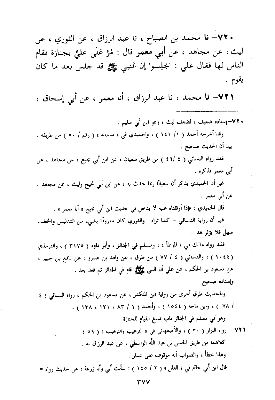 720 - نا مُحَمَّدُ بْنُ الصَّبَّاحِ، نا عَبْدُ الرَّزَّاقِ، عَنِ الثَّوْرِيِّ، عَنْ لَيْثٍ، عَنْ مُجَاهِدٍ، عَنْ أَبِي مَعْمَرٍ قَالَ: §مُرَّ عَلَى عَلِيٍّ بِجِنَازَةٍ فَقَامَ النَّاسُ لَهَا فَقَالَ عَلِيٌّ: اجْلِسُوا إِنَّ النَّبِيَّ صَلَّى اللَّهُ عَلَيْهِ وَسَلَّمَ قَدْ جَلَسَ بَعْدَ مَا كَانَ يَقُومُ