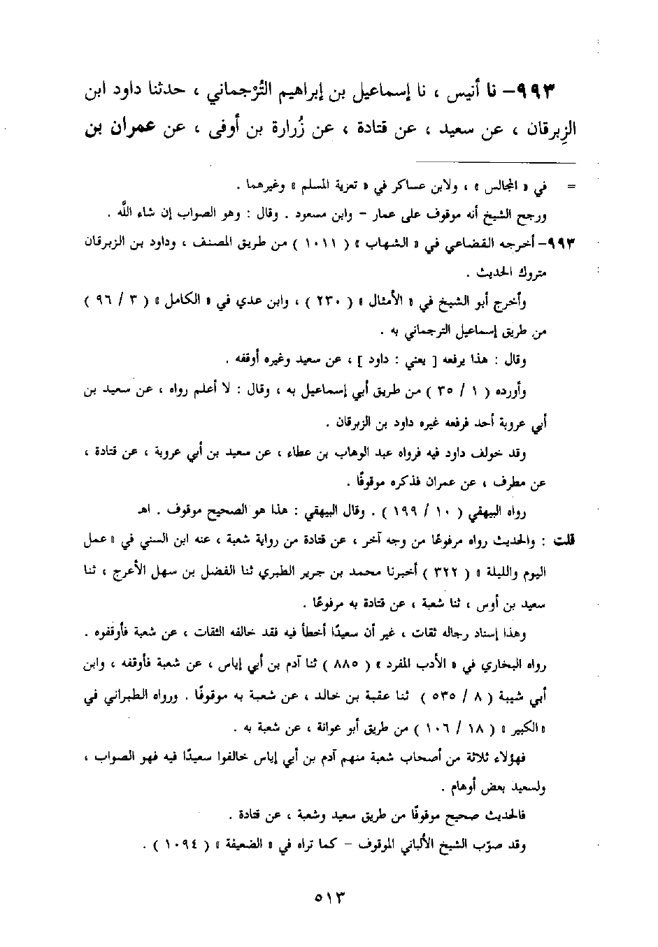 993 - نا أُنَيْسٌ، نا إِسْمَاعِيلُ بْنُ إِبْرَاهِيمَ التَّرْجُمَانِيُّ، حَدَّثَنَا دَاوُدُ بْنُ الزِّبْرِقَانِ، عَنْ سَعِيدٍ، عَنْ قَتَادَةَ، عَنْ زُرَارَةَ بْنِ أَبِي أَوْفَى عَنْ عِمْرَانَ بْنِ -[514]- حُصَيْنٍ، أَنَّ النَّبِيَّ صَلَّى اللَّهُ عَلَيْهِ وَسَلَّمَ قَالَ: «إِنَّ §فِي الْمَعَارِيضَ مَنْدُوحَةً عَنِ الْكَذِبِ»