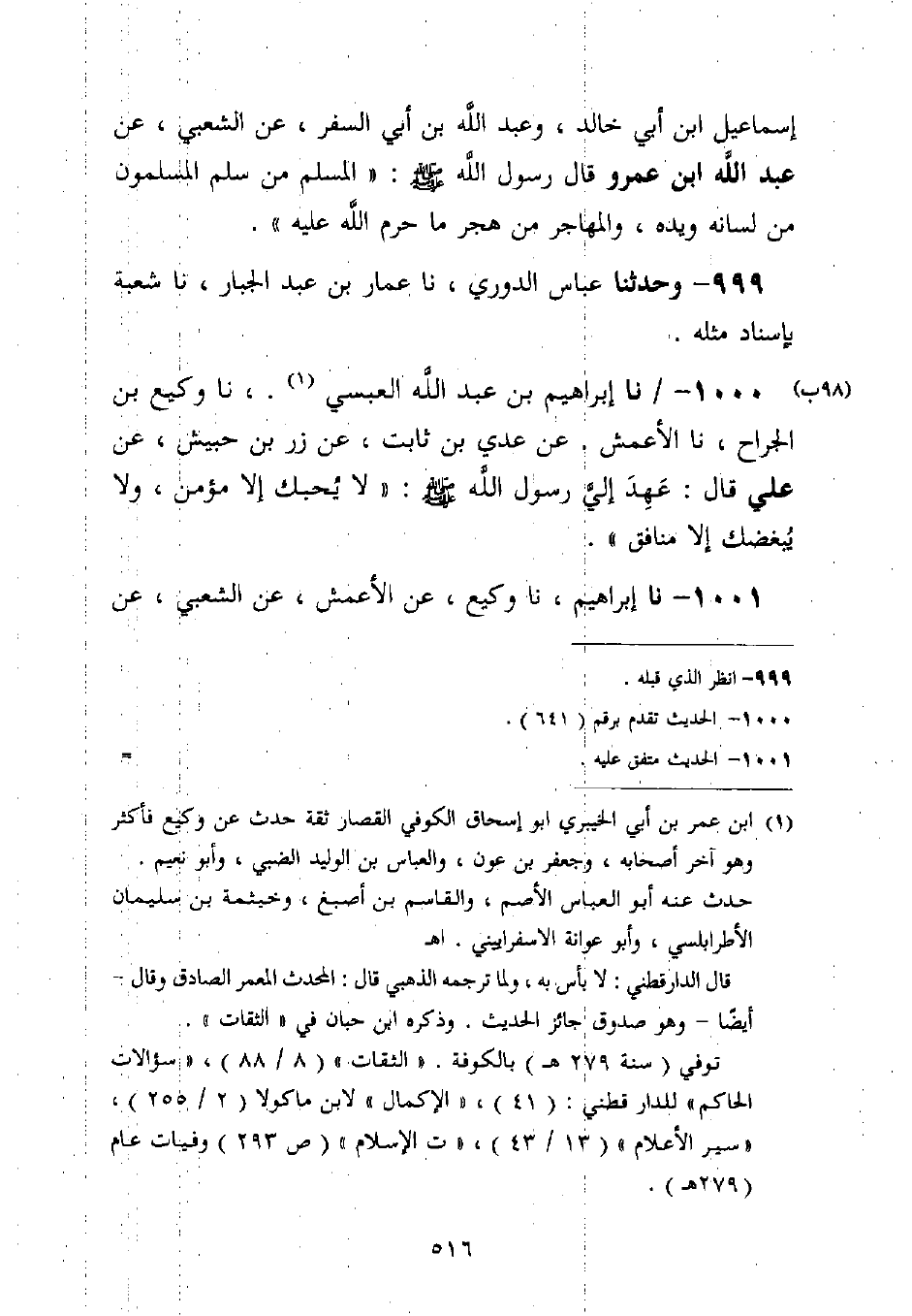 1000 - نا إِبْرَاهِيمُ بْنُ عَبْدِ اللَّهِ الْعَبْسِيُّ، نا وَكِيعُ بْنُ الْجَرَّاحِ، نا الْأَعْمَشُ، عَنْ عَدِيِّ بْنِ ثَابِتٍ، عَنْ زِرِّ بْنِ حُبَيْشٍ، عَنْ عَلِيٍّ قَالَ: عَهِدَ إِلَيَّ رَسُولُ اللَّهِ صَلَّى اللَّهُ عَلَيْهِ وَسَلَّمَ: «§لَا يُحِبُّكُ إِلَّا مُؤْمِنٌ، وَلَا يُبْغِضُكَ إِلَّا مُنَافِقٌ»
