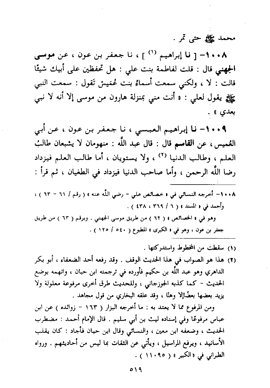 1009 - نا إِبْرَاهِيمُ الْعَبْسِيُّ، نا جَعْفَرُ بْنُ عَوْنٍ، عَنْ أَبِي الْعُمَيْسِ، عَنِ الْقَاسِمِ قَالَ: قَالَ عَبْدُ اللَّهِ: " §مَنْهُومَانِ لَا يَشْبَعَانِ طَالِبُ الْعِلْمِ، وَطَالِبُ الدُّنْيَا، وَلَا يَسْتَوِيَانِ، أَمَّا طَالِبُ الْعِلْمِ، فَيَزْدَادُ رِضَا اللَّهِ الرَّحْمَنِ، وَأَمَّا صَاحِبُ الدُّنْيَا، فَيَزْدَادُ فِي الطُّغْيَانِ، ثُمَّ قَرَأَ: -[520]- {كَلَّا إِنَّ الْإِنْسَانَ لَيَطْغَى أَنْ رَآهُ اسْتَغْنَى} [العلق: 7] "