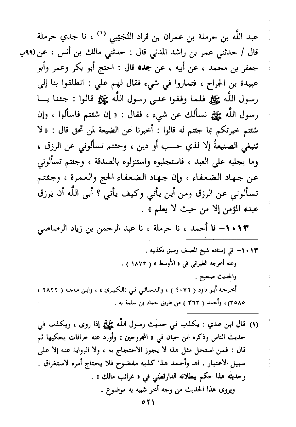 1014 - نا أَحْمَدُ، نا جَدِّي، نا عَبْدُ الرَّحْمَنِ بْنُ زِيَادٍ الرُّصَاصِيُّ، نا شُعْبَةُ، عَنْ أَبِي الزُّبَيْرِ، عَنْ جَابِرٍ، عَنِ النَّبِيِّ صَلَّى اللَّهُ عَلَيْهِ وَسَلَّمَ مِثْلَهُ