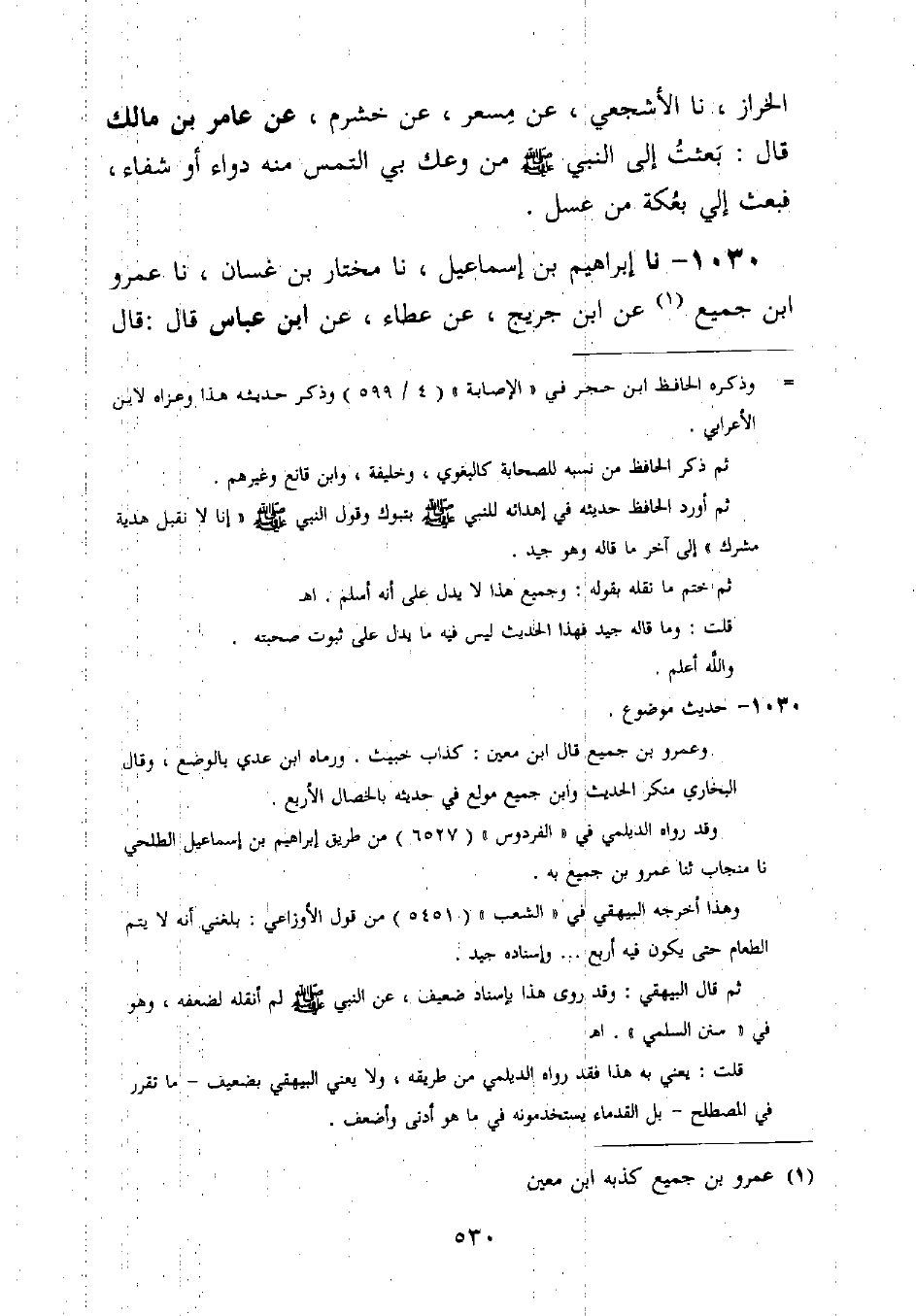 1030 - نا إِبْرَاهِيمُ بْنُ إِسْمَاعِيلَ، نا مُخْتَارُ بْنُ غَسَّانَ، نا عَمْرُو بْنُ جُمَيْعٍ، عَنِ ابْنِ جُرَيْجٍ، عَنْ عَطَاءٍ عَنِ ابْنِ عَبَّاسٍ قَالَ: قَالَ -[531]- رَسُولُ اللَّهِ صَلَّى اللَّهُ عَلَيْهِ وَسَلَّمَ: §مَا مِنْ مَائِدَةٍ عَلَيْهَا أَرْبَعُ خِصَالٍ إِلَّا أُكْمِلَتْ، إِذَا أَكَلَ قَالَ: بِسْمِ اللَّهِ، وَإِذَا فَرَغَ قَالَ: الْحَمْدُ لِلَّهِ، وَكَثُرَتْ عَلَيْهَا الْأَيْدِي، وَكَانَ أَصْلُهَا حَلَالًا