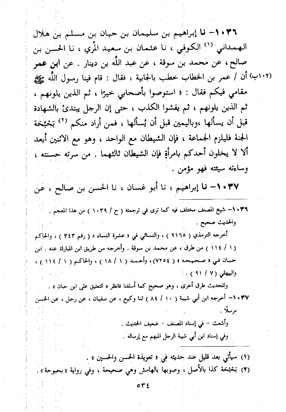 1036 - نا إِبْرَاهِيمُ بْنُ سُلَيْمَانَ بْنِ حَيَّانَ بْنِ مُسْلِمِ بْنِ هِلَالٍ الْهَمْدَانِيُّ الْكُوفِيُّ، نا عُثْمَانُ بْنُ سَعِيدٍ الْمُرِّيُّ، نا الْحَسَنُ بْنُ صَالِحٍ، عَنْ مُحَمَّدِ بْنِ سُوقَةَ، عَنْ عَبْدِ اللَّهِ بْنِ دِينَارٍ، عَنِ ابْنِ عُمَرَ، أَنَّ عُمَرَ بْنَ الْخَطَّابِ، خَطَبَ بِالْجَابِيَةِ، فَقَالَ: قَامَ فِينَا رَسُولُ اللَّهِ صَلَّى اللَّهُ عَلَيْهِ وَسَلَّمَ مَقَامِي فِيكُمْ، فَقَالَ: §اسْتَوْصُوا بِأَصْحَابِي خَيْرًا، ثُمَّ الَّذِينَ يَلُونَهُمْ، ثُمَّ الَّذِينَ يَلُونَهُمْ، ثُمَّ يَفْشُوا الْكَذِبُ، حَتَّى إِنَّ الرَّجُلَ يَبْتَدِئُ بِالشَّهَادَةِ قَبْلَ أَنْ يُسْأَلَهَا، وَبِالْيَمِينِ قَبْلَ أَنْ يُسْأَلَهَا، فَمَنْ أَرَادَ مِنْكُمْ بَحْبُحَةَ الْجَنَّةِ فَلْيَلْزَمِ الْجَمَاعَةَ، فَإِنَّ الشَّيْطَانَ مَعَ الْوَاحِدِ، وَهُوَ مَعَ الِاثْنَيْنِ أَبْعَدُ، أَلَا لَا يَخْلُوَنَّ أَحَدُكُمْ بِامْرَأَةٍ، فَإِنَّ الشَّيْطَانَ ثَالِثُهُمَا. مَنْ سَرَّتْهُ حَسَنَتُهُ، وَسَاءَتْهُ سَيِّئَتُهُ فَهُوَ مُؤْمِنٌ