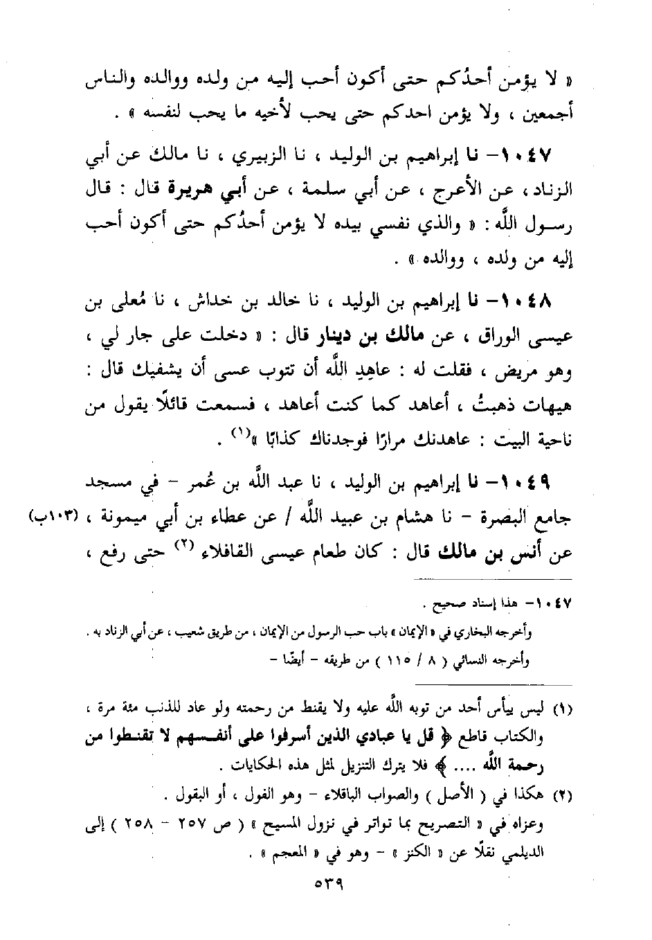 1047 - نا إِبْرَاهِيمُ بْنُ الْوَلِيدِ، نا الزُّبَيْرِيُّ، نا مَالِكٌ، عَنْ أَبِي الزِّنَادِ، عَنِ الْأَعْرَجِ، عَنْ أَبِي سَلَمَةَ عَنْ أَبِي هُرَيْرَةَ قَالَ: قَالَ رَسُولُ اللَّهِ: وَالَّذِي نَفْسِي بِيَدِهِ §لَا يُؤْمِنُ أَحَدُكُمْ حَتَّى أَكُونَ أَحَبَّ إِلَيْهِ مِنْ وَلَدِهِ، وَوَالِدِهِ