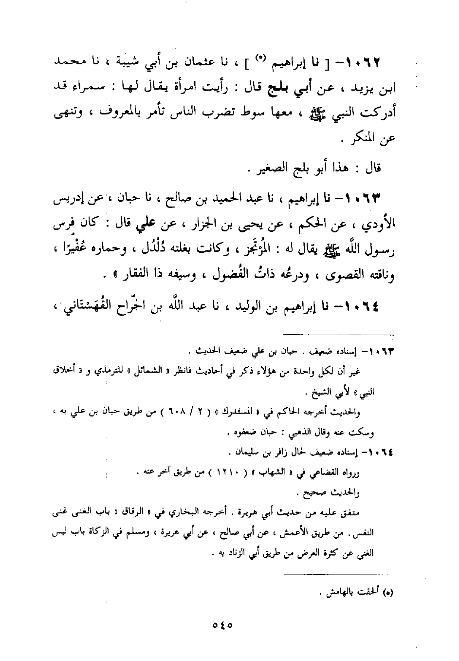 1062 - نا إِبْرَاهِيمُ، نا عُثْمَانُ بْنُ أَبِي شَيْبَةَ، نا مُحَمَّدُ بْنُ يَزِيدَ عَنْ أَبِي بَلْجٍ قَالَ: رَأَيْتُ امْرَأَةً يُقَالُ لَهَا: سَمْرَاءُ قَدْ أَدْرَكَتِ النَّبِيَّ صَلَّى اللَّهُ عَلَيْهِ وَسَلَّمَ، مَعَهَا سَوْطٌ §تَضْرِبُ النَّاسَ تَأْمُرُ بِالْمَعْرُوفِ، وَتَنْهَى عَنِ الْمُنْكَرِ قَالَ: هَذَا أَبُو بَلْجٍ الصَّغِيرُ
