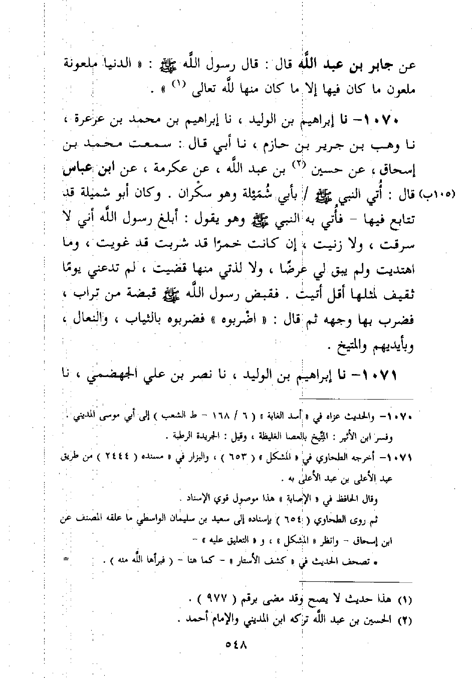 1070 - نا إِبْرَاهِيمُ بْنُ الْوَلِيدِ، نا إِبْرَاهِيمُ بْنُ مُحَمَّدِ بْنِ عَرْعَرَةَ، نا وَهْبُ بْنُ جَرِيرِ بْنِ حَازِمٍ، نا أَبِي قَالَ: سَمِعْتُ مُحَمَّدَ بْنَ إِسْحَاقَ، عَنْ حُسَيْنِ بْنِ عَبْدِ اللَّهِ، عَنْ عِكْرِمَةَ عَنِ ابْنِ عَبَّاسٍ قَالَ: أُتِيَ النَّبِيُّ صَلَّى اللَّهُ عَلَيْهِ وَسَلَّمَ بِأَبِي شُمَيْلَةَ، وَهُوَ سَكْرَانُ. وَكَانَ أَبُو شُمَيْلَةَ قَدْ تَتَابَعَ فِيهَا فَأُتِيَ بِهِ النَّبِيُّ صَلَّى اللَّهُ عَلَيْهِ وَسَلَّمَ، وَهُوَ يَقُولُ: أَبْلِغْ رَسُولَ اللَّهِ أَنِّي لَا سَرَقْتُ، وَلَا زَنَيْتُ، وَإِنْ كَانَتْ خَمْرًا قَدْ شَرِبْتُ قَدْ غَوَيْتُ، وَمَا اهْتَدَيْتُ، وَلَمْ يَبْقَ لِي عَرَضًا، وَلَا لَذَّتِي مِنْهَا قَضَيْتُ، وَلَمْ تَدْعُنِي يَوْمًا ثَقِيفٌ لِمِثْلِهَا أَقُلْ أَتَيْتُ. فَقَبَضَ رَسُولُ اللَّهِ صَلَّى اللَّهُ عَلَيْهِ وَسَلَّمَ قَبْضَةً مِنْ تُرَابٍ، فَضَرَبَ بِهَا وَجْهَهُ، ثُمَّ قَالَ: §اضْرِبُوهُ، فَضَرَبُوهُ بِالثِّيَابِ، وَالنِّعَالِ، وَبِأَيْدِيهِمْ وَالْمِتِّيخِ