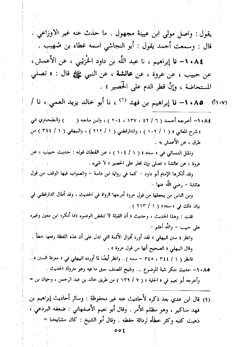 1084 - نا إِبْرَاهِيمُ، نا عَبْدُ اللَّهِ بْنُ دَاوُدَ الْخُرَيْبِيُّ، عَنِ الْأَعْمَشِ، عَنْ حَبِيبٍ، عَنْ عُرْوَةَ، عَنْ عَائِشَةَ، عَنِ النَّبِيِّ صَلَّى اللَّهُ عَلَيْهِ وَسَلَّمَ قَالَ: §تُصَلِّي الْمُسْتَحَاضَةُ، وَإِنْ قَطَرَ الدَّمُ عَلَى الْحَصِيرِ