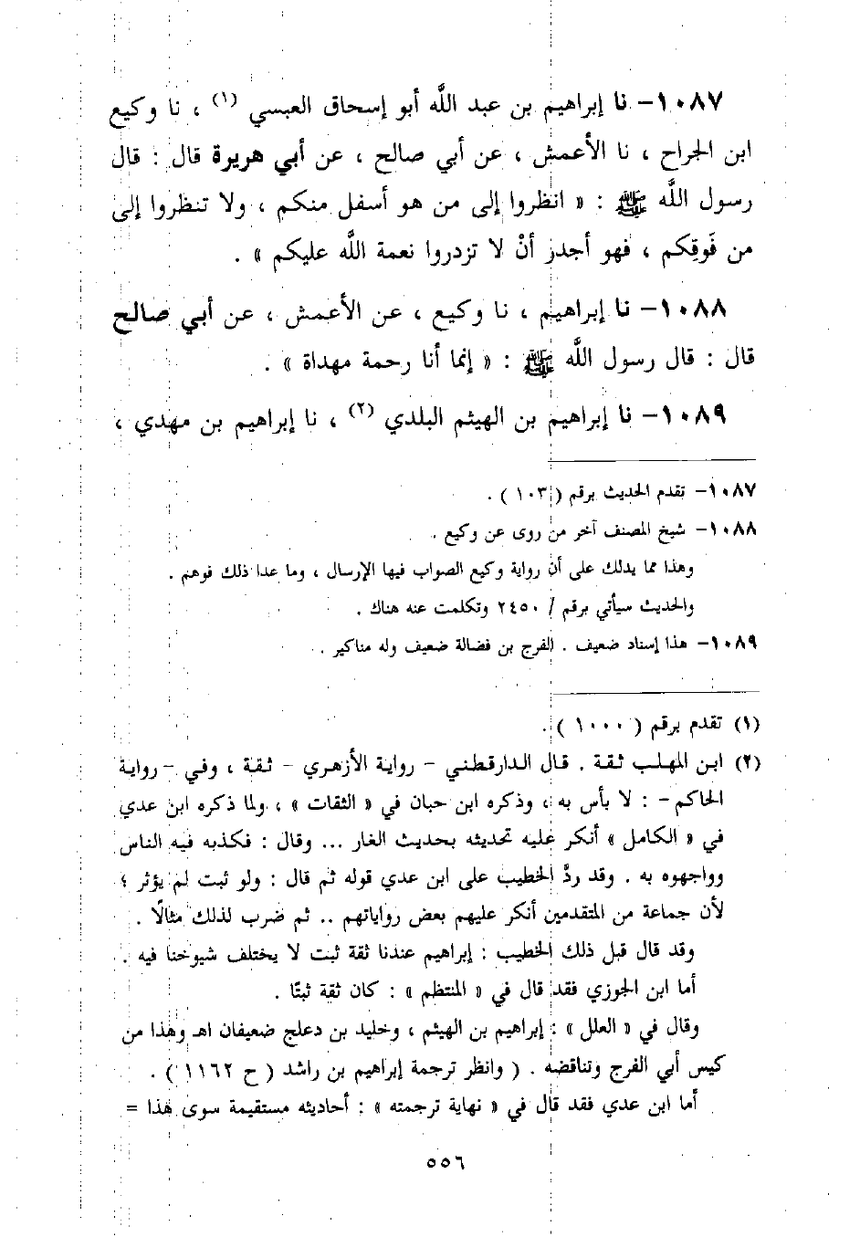 1087 - نا إِبْرَاهِيمُ بْنُ عَبْدِ اللَّهِ أَبُو إِسْحَاقَ الْعَبْسِيُّ، نا وَكِيعُ بْنُ الْجَرَّاحِ، نا الْأَعْمَشُ، عَنْ أَبِي صَالِحٍ عَنْ أَبِي هُرَيْرَةَ قَالَ: قَالَ رَسُولُ اللَّهِ صَلَّى اللَّهُ عَلَيْهِ وَسَلَّمَ: §انْظُرُوا إِلَى مَنْ هُوَ أَسْفَلَ مِنْكُمْ، وَلَا تَنْظُرُوا إِلَى مَنْ فَوْقِكُمْ، فَهُوَ أَجْدَرُ أَنْ لَا تَزْدَرُوا نِعْمَةَ اللَّهِ عَلَيْكُمْ