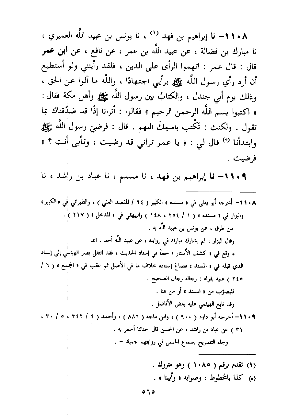 1108 - نا إِبْرَاهِيمُ بْنُ فَهْدٍ، نا يُونُسُ بْنُ عُبَيْدِ اللَّهِ الْعُمَيْرِيُّ، نا مُبَارَكُ بْنُ فَضَالَةَ، عَنْ عُبَيْدِ اللَّهِ بْنِ عُمَرَ، عَنْ نَافِعٍ، عَنِ ابْنِ عُمَرَ قَالَ: قَالَ عُمَرُ: اتَّهِمُوا الرَّأْيَ عَلَى الدِّينِ، فَلَقَدْ رَأَيْتُنِي وَلَوْ أَسْتَطِيعُ أَنْ أَرُدَّ رَأْيَ رَسُولِ اللَّهِ صَلَّى اللَّهُ عَلَيْهِ وَسَلَّمَ بِرَأْيِي اجْتِهَادًا، وَاللَّهِ مَا آلُو عَنِ الْحَقِّ، وَذَلِكَ يَوْمُ أَبِي جَنْدَلٍ، وَالْكِتَابُ بَيْنَ رَسُولِ اللَّهِ صَلَّى اللَّهُ عَلَيْهِ وَسَلَّمَ، وَأَهْلِ مَكَّةَ، فَقَالَ: §اكْتُبُوا بِسْمِ اللَّهِ الرَّحْمَنِ الرَّحِيمِ فَقَالُوا: أَتَرَانَا إِذًا قَدْ صَدَّقْنَاكَ بِمَا تَقُولُ. وَلَكِنَّكَ: تَكْتُبُ بِاسْمِكَ اللَّهُمَّ. قَالَ: فَرَضِيَ رَسُولُ اللَّهِ صَلَّى اللَّهُ عَلَيْهِ وَسَلَّمَ، وَأَبَيْنَا قَالَ لِي: يَا عُمَرُ تَرَانِي قَدْ رَضِيتُ، وَتَأْبَى أَنْتَ؟ فَرَضِيتُ