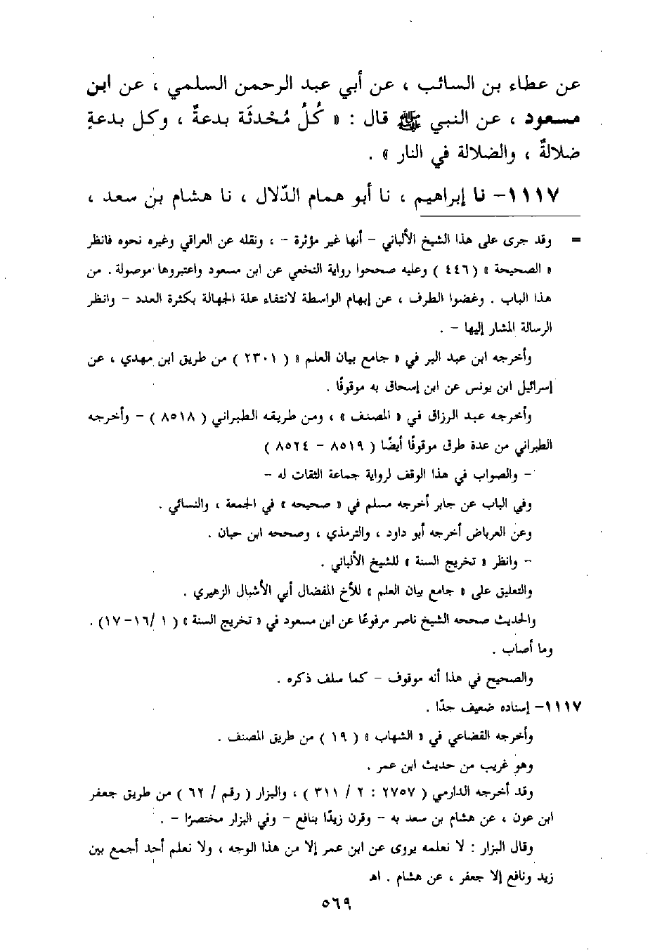 1117 - نا إِبْرَاهِيمُ، نا أَبُو هَمَّامٍ الدَّلَّالُ، نا هِشَامُ بْنُ سَعْدٍ، -[570]- عَنْ نَافِعٍ عَنِ ابْنِ عُمَرَ قَالَ: قَالَ رَسُولُ اللَّهِ صَلَّى اللَّهُ عَلَيْهِ وَسَلَّمَ: §الدِّينُ النَّصِيحَةُ، قِيلَ: لِمَنْ يَا رَسُولَ اللَّهِ؟ قَالَ: لِلَّهِ، وَلِرَسُولِهِ، وَلِكِتَابِهِ، وَلِأَئِمَّةِ الْمُسْلِمِينَ وَعَامَّتِهِمْ