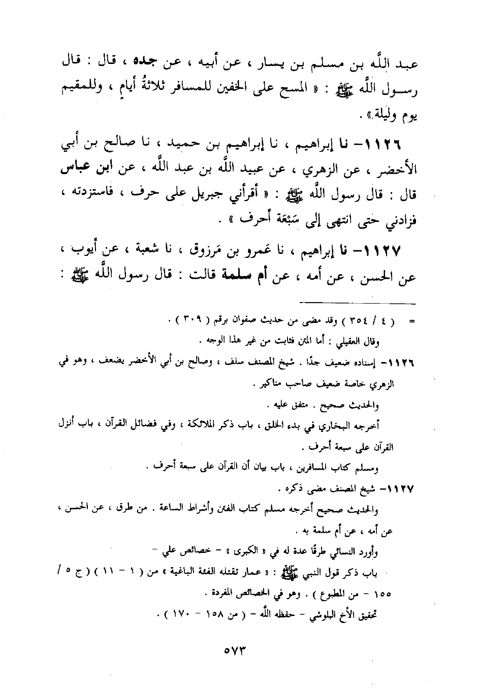 1126 - نا إِبْرَاهِيمُ، نا إِبْرَاهِيمُ بْنُ حُمَيْدٍ، نا صَالِحُ بْنُ أَبِي الْأَخْضَرِ، عَنِ الزُّهْرِيِّ، عَنْ عُبَيْدِ اللَّهِ بْنِ عَبْدِ اللَّهِ عَنِ ابْنِ عَبَّاسٍ قَالَ: قَالَ رَسُولُ اللَّهِ صَلَّى اللَّهُ عَلَيْهِ وَسَلَّمَ: §أَقْرَأَنِي جِبْرِيلُ عَلَى حَرْفٍ، فَاسْتَزَدْتُهُ، فَزَادَنِي حَتَّى انْتَهَى إِلَى سَبْعَةِ أَحْرُفٍ