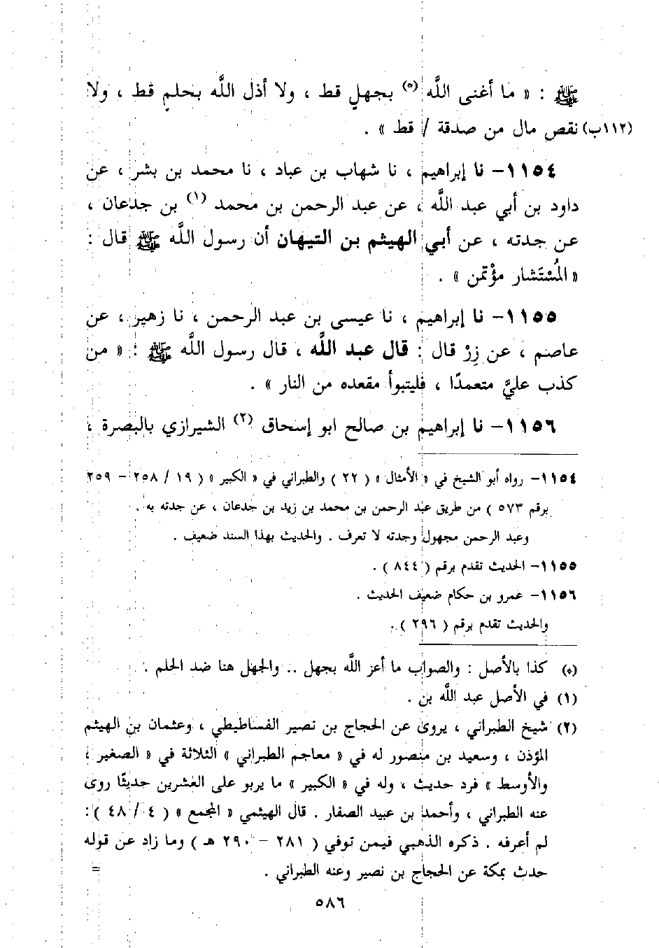 1155 - نا إِبْرَاهِيمُ، نا عِيسَى بْنُ عَبْدِ الرَّحْمَنِ، نا زُهَيْرٌ، عَنْ عَاصِمٍ عَنْ زِرٍّ قَالَ: قَالَ عَبْدُ اللَّهِ: قَالَ رَسُولُ اللَّهِ صَلَّى اللَّهُ عَلَيْهِ وَسَلَّمَ: §مَنْ كَذَبَ عَلَيَّ مُتَعَمِّدًا، فَلْيَتَبَوَّأْ مَقْعَدَهُ مِنَ النَّارِ