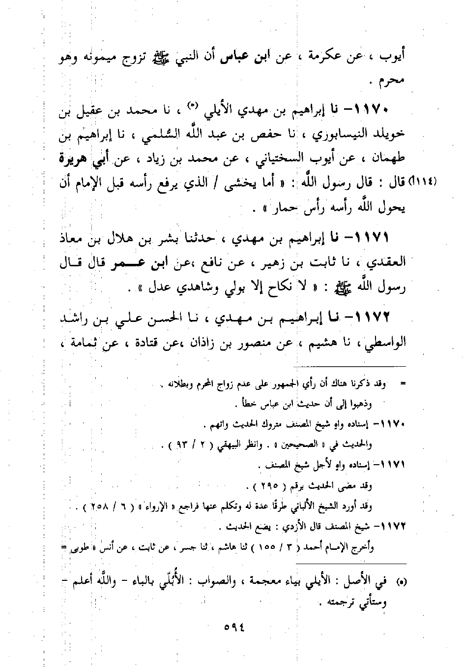 1171 - نا إِبْرَاهِيمُ بْنُ مَهْدِيٍّ، حَدَّثَنَا بِشْرُ بْنُ هِلَالِ بْنِ مُعَاذٍ الْعَقَدِيُّ، نا ثَابِتُ بْنُ زُهَيْرٍ، عَنْ نَافِعٍ عَنِ ابْنِ عُمَرَ قَالَ: قَالَ رَسُولُ اللَّهِ صَلَّى اللَّهُ عَلَيْهِ وَسَلَّمَ: §لَا نِكَاحَ إِلَّا بِوَلِيٍّ وَشَاهِدَيْ عَدْلٍ