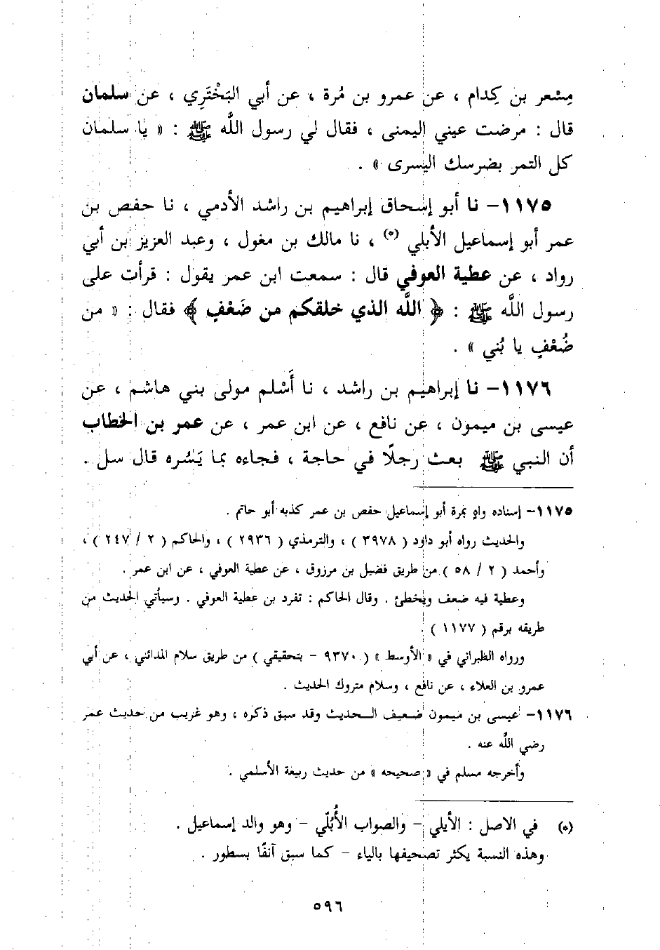 1175 - نا أَبُو إِسْحَاقَ إِبْرَاهِيمُ بْنُ رَاشِدٍ الْآدَمَيُّ، نا حَفْصُ بْنُ عُمَرَ أَبُو إِسْمَاعِيلَ الْأُبُلِّيُّ، نا مَالِكُ بْنُ مِغْوَلٍ، وَعَبْدُ الْعَزِيزِ بْنُ أَبِي رَوَّادٍ، عَنْ عَطِيَّةَ الْعَوْفِيِّ قَالَ: سَمِعْتُ ابْنَ عُمَرَ يَقُولُ: قَرَأْتُ عَلَى رَسُولِ اللَّهِ صَلَّى اللَّهُ عَلَيْهِ وَسَلَّمَ: {§اللَّهُ الَّذِي خَلَقَكُمْ مِنْ ضَعْفٍ} [الروم: 54] فَقَالَ: (مِنْ ضُعْفٍ) يَا بُنَيَّ