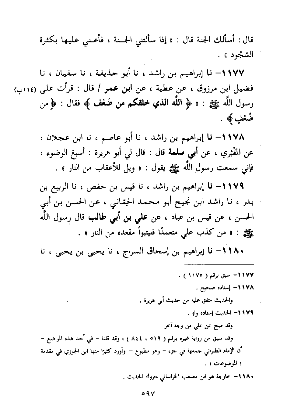 1179 - نا إِبْرَاهِيمُ بْنُ رَاشِدٍ، نا قَيْسُ بْنُ حَفْصٍ، نا الرَّبِيعُ بْنُ بَدْرٍ، نا رَاشِدُ بْنُ نَجِيحٍ أَبُو مُحَمَّدٍ الْحِمَّانِيُّ، عَنِ الْحَسَنِ بْنِ أَبِي الْحَسَنِ، عَنْ قَيْسِ بْنِ عَبَّادٍ عَنْ عَلِيِّ بْنِ أَبِي طَالِبٍ قَالَ رَسُولُ اللَّهِ صَلَّى اللَّهُ عَلَيْهِ وَسَلَّمَ: §مَنْ كَذَبَ عَلَيَّ مُتَعَمِّدًا فَلْيَتَبَوَّأْ مَقْعَدَهُ مِنَ النَّارِ