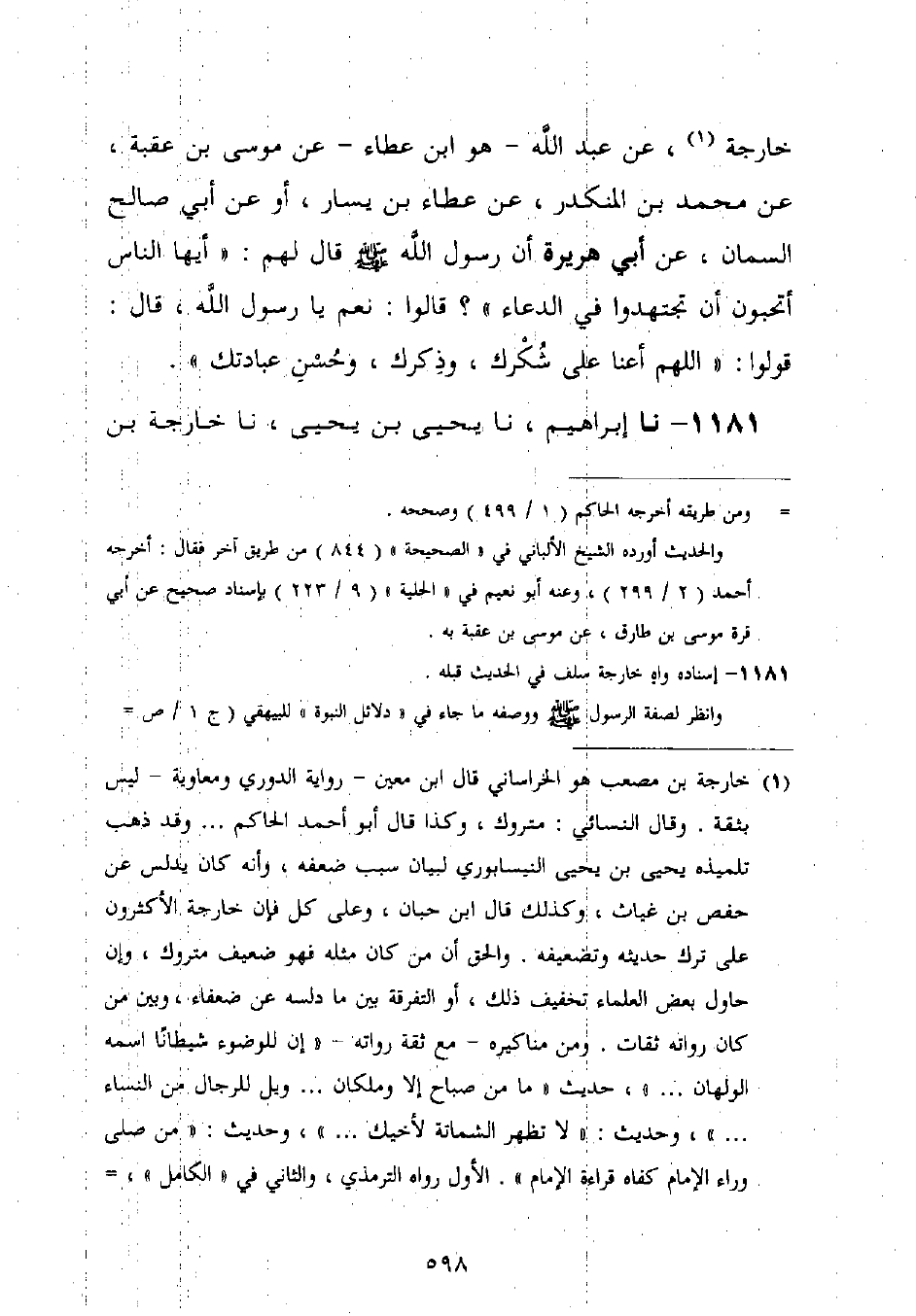1181 - نا إِبْرَاهِيمُ، نا يَحْيَى بْنُ يَحْيَى، نا خَارِجَةُ بْنُ -[599]- مُصْعَبٍ، عَنْ عَبْدِ اللَّهِ هُوَ ابْنُ عُطَارِدٍ عَنْ مُحَمَّدِ بْنِ عَجْلَانَ، عَنْ سَعِيدٍ الْمَقْبُرِيِّ عَنْ أَبِي هُرَيْرَةَ، أَنَّهُ كَانَ إِذَا وَصَفَ النَّبِيَّ صَلَّى اللَّهُ عَلَيْهِ وَسَلَّمَ قَالَ: كَانَ §أَبْيَضَ الْخَدَّيْنِ أَزَجَّ الْعَيْنَيْنِ، عَبْلَ الذِّرَاعَيْنِ، ضَخْمَ الْقَدَمَيْنِ، يُقْبِلُ جَمِيعًا، وَيُدْبِرُ جَمِيعًا، لَا تَرَ عَيْنٌ فِي قَوْمٍ قَطُّ مِثْلَهُ صَلَّى اللَّهُ عَلَيْهِ وَسَلَّمَ