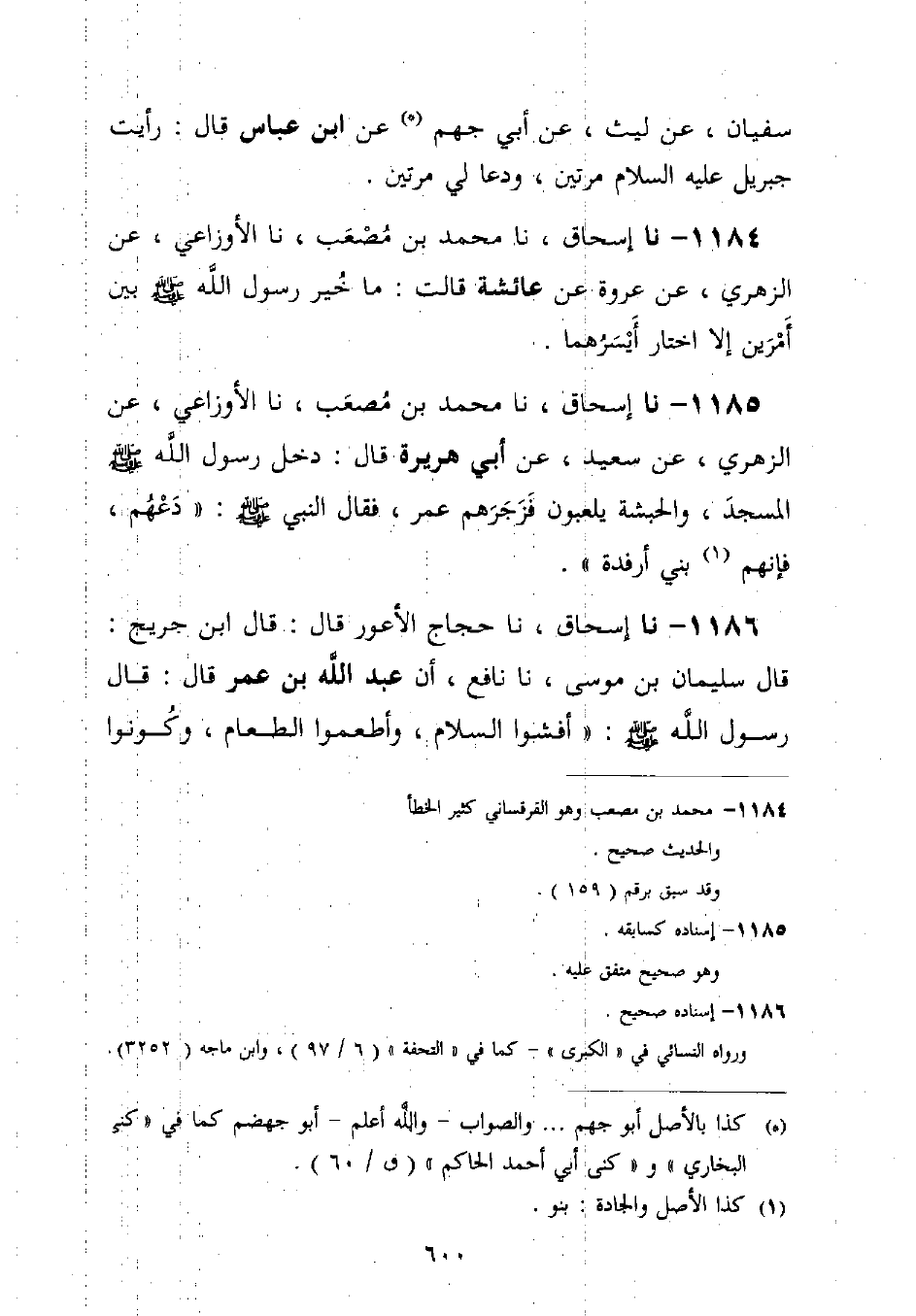 1185 - نا إِسْحَاقُ، نا مُحَمَّدُ بْنُ مُصْعَبٍ، نا الْأَوْزَاعِيُّ، عَنِ الزُّهْرِيِّ، عَنْ سَعِيدٍ عَنْ أَبِي هُرَيْرَةَ قَالَ: دَخَلَ رَسُولُ اللَّهِ صَلَّى اللَّهُ عَلَيْهِ وَسَلَّمَ الْمَسْجِدَ، وَالْحَبَشَةُ يَلْعَبُونَ فَزَجَرَهُمْ عُمَرُ، فَقَالَ النَّبِيُّ صَلَّى اللَّهُ عَلَيْهِ وَسَلَّمَ: §دَعْهُمْ، فَإِنَّهُمْ بَنِي أَرْفِدَةٍ