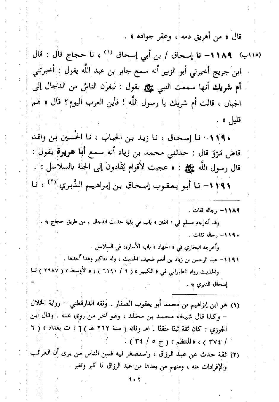 1189 - نا إِسْحَاقُ بْنُ أَبِي إِسْحَاقَ، نا حَجَّاجُ قَالَ: قَالَ ابْنُ جُرَيْجٍ أَخْبَرَنِي أَبُو الزُّبَيْرِ، أَنَّهُ سَمِعَ جَابِرَ بْنَ عَبْدِ اللَّهِ يَقُولُ: أَخْبَرَتْنِي أُمُّ شَرِيكٍ، أَنَّهَا سَمِعَتِ النَّبِيَّ صَلَّى اللَّهُ عَلَيْهِ وَسَلَّمَ يَقُولُ: §لَيَفِرَّنَّ النَّاسُ مِنَ الدَّجَّالِ إِلَى الْجِبَالِ، قَالَتْ أُمُّ شَرِيكٍ: يَا رَسُولَ اللَّهِ فَأَيْنَ الْعَرَبُ الْيَوْمَ؟ قَالَ: هُمْ قَلِيلٌ