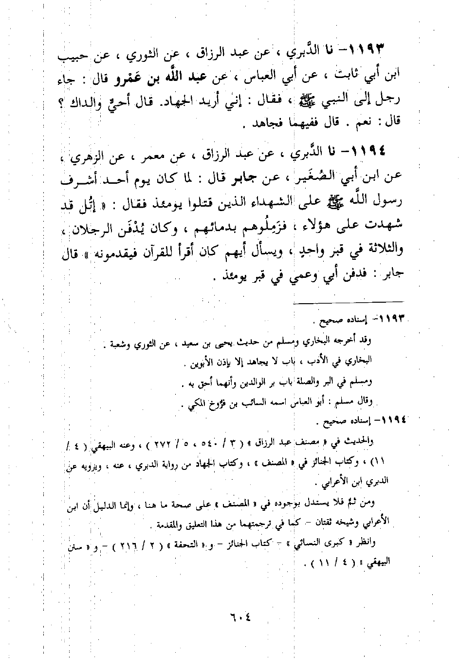 1193 - نا الدَّبَرِيُّ، عَنْ عَبْدِ الرَّزَّاقِ، عَنِ الثَّوْرِيِّ، عَنْ حَبِيبِ بْنِ أَبِي ثَابِتٍ، عَنْ أَبِي الْعَبَّاسِ عَنْ عَبْدِ اللَّهِ بْنِ عَمْرٍو قَالَ: جَاءَ رَجُلٌ إِلَى النَّبِيِّ صَلَّى اللَّهُ عَلَيْهِ وَسَلَّمَ، فَقَالَ: إِنِّي أُرِيدُ الْجِهَادَ. قَالَ: §أَحَيٌّ وَالِدَاكَ؟ قَالَ: نَعَمْ. قَالَ: فَفِيهِمَا فَجَاهِدْ