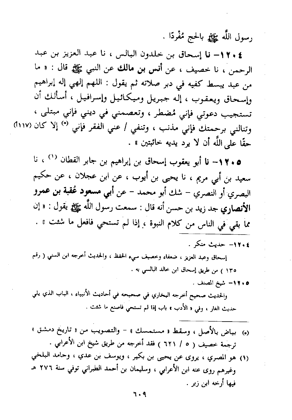 1204 - نا إِسْحَاقُ بْنُ خَلْدُونَ الْبَالِسِيُّ، نا عَبْدُ الْعَزِيزِ بْنُ عَبْدِ الرَّحْمَنِ، نا خُصَيْفٌ عَنْ أَنَسِ بْنِ مَالِكٍ، عَنِ النَّبِيِّ صَلَّى اللَّهُ عَلَيْهِ وَسَلَّمَ قَالَ: §مَا مِنْ عَبْدِ يَبْسُطُ كَفَّيْهِ فِي دُبُرِ صَلَاتِهِ، ثُمَّ يَقُولُ: اللَّهُمَّ إِلَهِي إِلَهَ إِبْرَاهِيمَ، وَإِسْحَاقَ وَيَعْقُوبَ، إِلَهَ جِبْرِيلَ وَمِيكَائِيلَ وَإِسْرَافِيلَ، أَسْأَلُكَ أَنْ تَسْتَجِيبَ دَعْوَتِي، فَإِنِّي مُضْطَرٌّ، وَتَعْصِمَنِي فِي دِينِي فَإِنِّي مُبْتَلًى، وَتَنَالَنِي بِرَحْمَتِكَ، فَإِنِّي مُذْنِبٌ، وَتَنْفِيَ عَنِّي الْفَقْرَ فَإِنِّي مُسْتَمْسِكٌ إِلَّا كَانَ حَقًّا عَلَى اللَّهِ أَنْ لَا يَرُدَّ يَدَيْهِ خَائِبَتَيْنِ