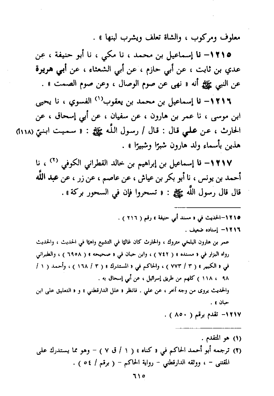 1217 - نا إِسْمَاعِيلُ بْنُ إِبْرَاهِيمَ بْنِ خَالِدٍ الْقَطْرَانِيُّ الْكُوفِيُّ، نا أَحْمَدُ بْنُ يُونُسَ، نا أَبُو بَكْرِ بْنُ عَيَّاشٍ، عَنْ عَاصِمٍ، عَنْ زِرٍّ عَنْ عَبْدِ اللَّهِ قَالَ: قَالَ رَسُولُ اللَّهِ صَلَّى اللَّهُ عَلَيْهِ وَسَلَّمَ: §تَسَحَّرُوا فَإِنَّ فِي السَّحُورِ بَرَكَةً. -[616]- قَالَ أَبُو إِبْرَاهِيمَ: كَذَا هُوَ فِي كِتَابِي مَرْفُوعٌ عَنْ أَحْمَدَ بْنِ يُونُسَ فِي مَوْضِعَيْنِ