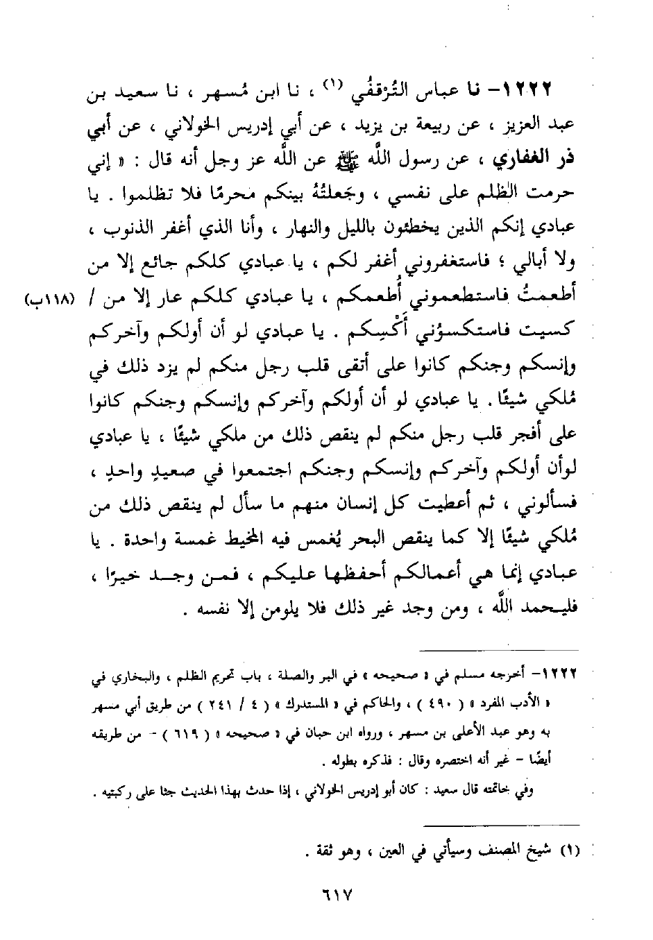 1222 - نا عَبَّاسٌ التَّرْقُفِيُّ، نا ابْنُ مُسْهِرٍ، نا سَعِيدُ بْنُ عَبْدِ الْعَزِيزِ، عَنْ رَبِيعَةَ بْنِ يَزِيدَ، عَنْ أَبِي إِدْرِيسَ الْخَوْلَانِيِّ عَنْ أَبِي ذَرٍّ الْغِفَارِيِّ، عَنْ رَسُولِ اللَّهِ صَلَّى اللَّهُ عَلَيْهِ وَسَلَّمَ عَنِ اللَّهِ عَزَّ وَجَلَّ أَنَّهُ قَالَ: §إِنِّي حَرَّمْتُ الظُّلْمَ عَلَى نَفْسِي، وَجَعَلْتُهُ بَيْنَكُمْ مُحَرَّمًا فَلَا تَظْلِمُوا، يَا عِبَادِي إِنَّكُمُ الَّذِينَ يُخْطِئُونَ بِاللَّيْلِ وَالنَّهَارِ، وَأَنَا الَّذِي أَغْفِرُ الذُّنُوبَ، وَلَا أُبَالِي، فَاسْتَغْفِرُونِي أَغْفِرْ لَكُمْ، يَا عِبَادِي كُلُّكُمْ جَائِعٌ إِلَّا مَنْ أَطْعَمْتُ فَاسْتَطْعِمُونِي أُطْعِمْكُمْ، يَا عِبَادِي كُلُّكُمْ عَارٍ إِلَّا مَنْ كَسَيْتُ فَاسْتَكْسُونِي أَكْسُكُمْ. يَا عِبَادِي، لَوْ أَنَّ أَوَّلَكُمْ وَآخِرَكُمْ وَإِنْسَكُمْ وَجِنَّكُمْ كَانُوا عَلَى أَتْقَى قَلْبُ رَجُلٍ مِنْكُمْ لَمْ يَزِدْ ذَلِكَ فِي مُلْكِي شَيْئًا. يَا عِبَادِي، لَوْ أَنَّ أَوَّلَكُمْ وَآخِرَكُمْ وَإِنْسَكُمْ وَجِنَّكُمْ كَانُوا عَلَى أَفْجَرِ قَلْبِ رَجُلٍ مِنْكُمْ لَمْ يَنْقُصْ ذَلِكَ مِنْ مُلْكِي شَيْئًا، يَا عِبَادِي، لَوْ أَنَّ أَوَّلَكُمْ وَآخِرَكُمْ وَإِنْسَكُمْ وَجِنَّكُمُ اجْتَمَعُوا فِي صَعِيدٍ وَاحِدٍ، فَسَأَلُونِي، ثُمَّ أَعْطَيْتُ كُلَّ إِنْسَانٍ مِنْهُمْ مَا سَأَلَ لَمْ يَنْقُصْ ذَلِكَ مِنْ مُلْكِي شَيْئًا إِلَّا كَمَا يَنْقُصُ الْبَحْرُ يُغْمَسُ فِيهِ الْمِخْيَطُ غَمْسَةً وَاحِدَةً. يَا عِبَادِي إِنَّمَا هِيَ أَعْمَالُكُمْ أَحْفَظُهَا عَلَيْكُمْ، فَمَنْ وَجَدَ خَيْرًا، فَلْيَحْمَدِ اللَّهَ، وَمَنْ وَجَدَ غَيْرَ ذَلِكَ فَلَا يَلُومَنَّ إِلَّا نَفْسَهُ