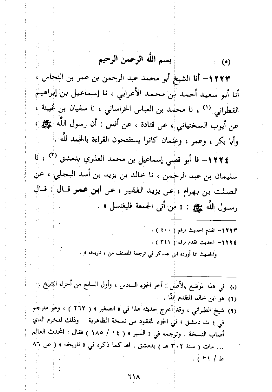 1223 - أَنَا الشَّيْخُ أَبُو مُحَمَّدِ بْنُ عَبْدِ الرَّحْمَنِ بْنِ عُمَرَ بْنِ النَّحَّاسِ أََنَا أَبُو سَعِيدٍ أَحْمَدُ بْنِ مُحَمَّدِ الْأَعْرَابِيُّ، نا إِسْمَاعِيلُ بْنُ إِبْرَاهِيمَ الْقَطْرَانِيُّ، نا مُحَمَّدُ بْنُ الْعَبَّاسِ الْخُرَاسَانِيُّ، نا سُفْيَانُ بْنُ عُيَيْنَةَ، عَنْ أَيُّوبَ السَّخْتِيَانِيِّ، عَنْ قَتَادَةَ عَنْ أَنَسٍ: §أَنَّ رَسُولَ اللَّهِ صَلَّى اللَّهُ عَلَيْهِ وَسَلَّمَ، وَأَبَا بَكْرٍ، وَعُمَرَ، وَعُثْمَانَ كَانُوا يَسْتَفْتِحُونَ الْقِرَاءَةَ بِـ {الْحَمْدُ لِلَّهِ} [الفاتحة: 2]