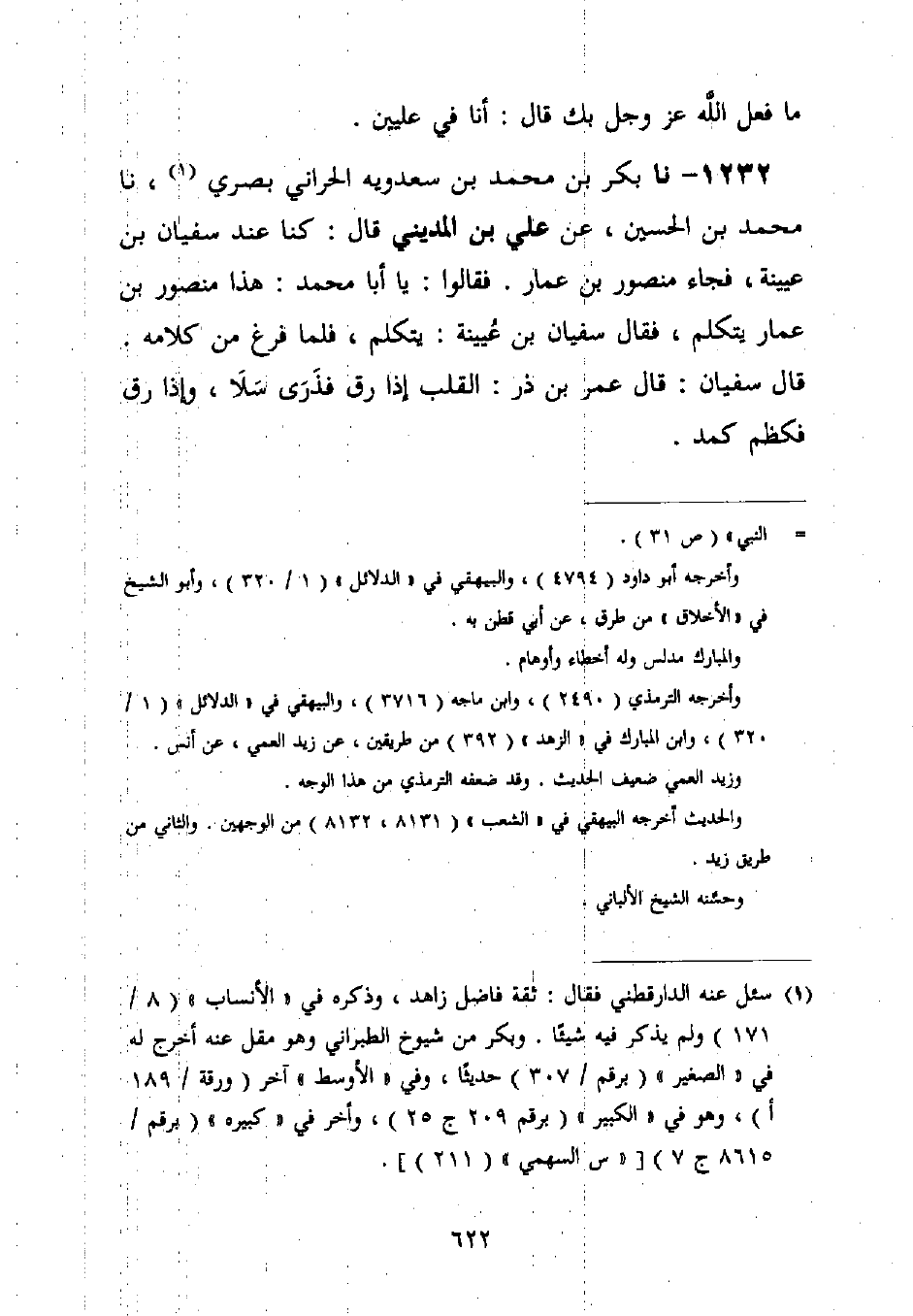 1232 - نا بَكْرُ بْنُ مُحَمَّدِ بْنِ سَعْدَوَيْهِ الْحَرَّانِيُّ، بَصَرِيٌّ، نا مُحَمَّدُ بْنُ الْحُسَيْنِ، عَنْ عَلِيِّ بْنِ الْمَدِينِيِّ قَالَ: كُنَّا عِنْدَ سُفْيَانَ بْنِ عُيَيْنَةَ، فَجَاءَ مَنْصُورُ بْنُ عَمَّارٍ، فَقَالُوا: يَا أَبَا مُحَمَّدٍ: هَذَا مَنْصُورُ بْنُ عَمَّارٍ يَتَكَلَّمُ، فَقَالَ سُفْيَانُ بْنُ عُيَيْنَةَ: يَتَكَلَّمُ، فَلَمَّا فَرَغَ مِنْ كَلَامِهِ. قَالَ سُفْيَانُ: قَالَ عُمَرُ بْنُ ذَرٍّ: §الْقَلْبُ إِذَا رَقَّ فَذَرَى سَلَا، وَإِذَا رَقَّ فَكَظَمَ كَمِدَ