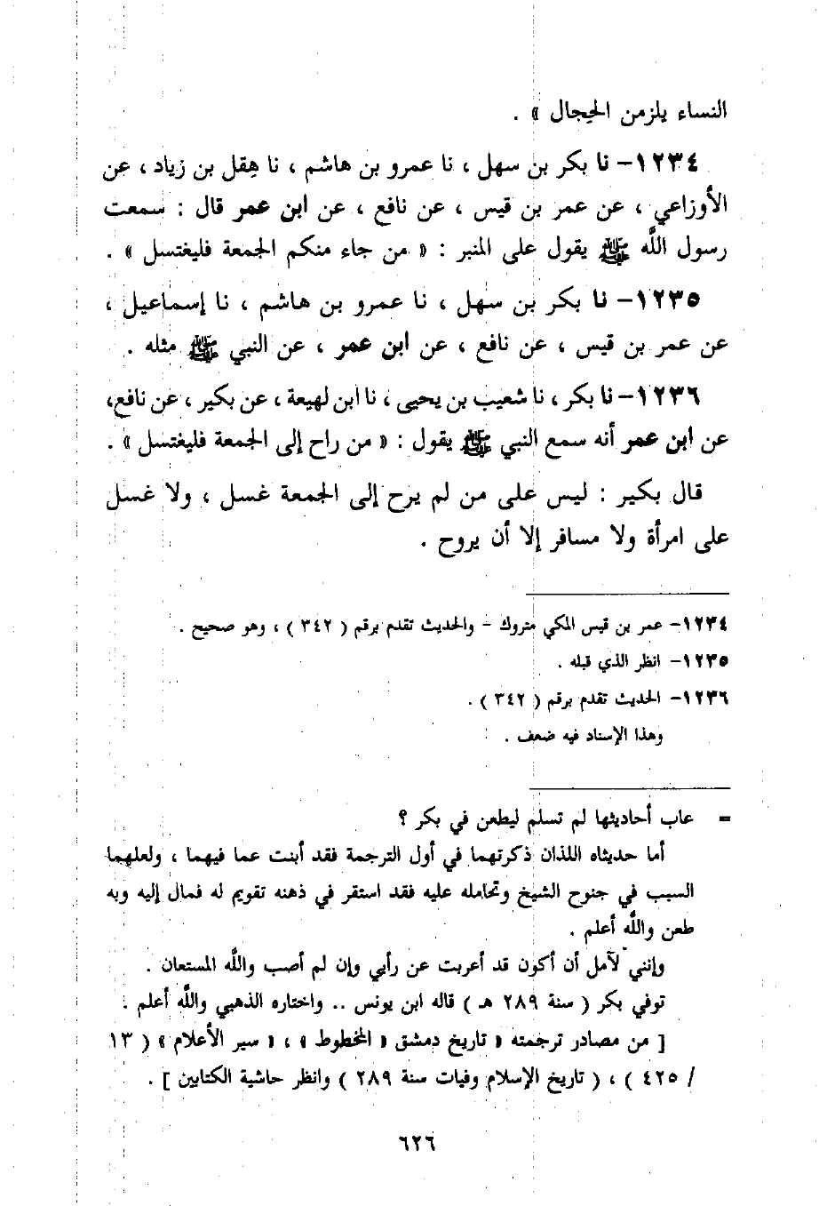 1236 - نا بَكْرٌ، نا شُعَيْبُ بْنُ يَحْيَى، نا ابْنُ لَهِيعَةَ، عَنْ بُكَيْرٍ، عَنْ نَافِعٍ عَنِ ابْنِ عُمَرَ، أَنَّهُ سَمِعَ النَّبِيَّ صَلَّى اللَّهُ عَلَيْهِ وَسَلَّمَ يَقُولُ: §مَنْ رَاحَ إِلَى الْجُمُعَةِ فَلْيَغْتَسِلْ قَالَ بُكَيْرٌ: لَيْسَ عَلَى مَنْ لَمْ يَرُحْ إِلَى الْجُمُعَةِ غُسْلٍ، وَلَا غُسْلَ عَلَى امْرَأَةٍ وَلَا مُسَافِرٍ إِلَّا أَنْ يَرُوحَ