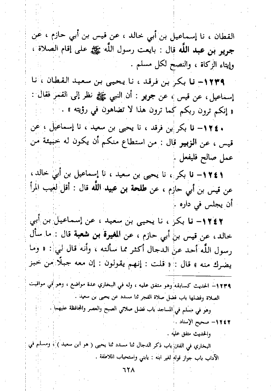 1239 - نا بَكْرُ بْنُ فَرْقَدٍ، نا يَحْيَى بْنُ سَعِيدٍ الْقَطَّانُ، نا إِسْمَاعِيلُ، عَنْ قَيْسٍ عَنْ جَرِيرٍ: أَنَّ النَّبِيَّ صَلَّى اللَّهُ عَلَيْهِ وَسَلَّمَ نَظَرَ إِلَى الْقَمَرَ فَقَالَ: §إِنَّكُمْ تَرَوْنَ رَبَّكُمْ كَمَا تَرَوْنَ هَذَا لَا تُضَاهُونَ فِي رُؤْيَتِهِ