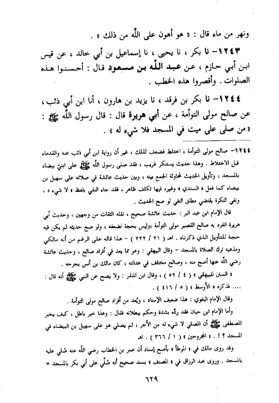 1244 - نا بَكْرُ بْنُ فَرْقَدٍ، نا يَزِيدُ بْنُ هَارُونَ، أنا ابْنُ أَبِي ذِئْبٍ، عَنْ صَالِحٍ مَولَى التَّوْأَمَةَ عَنْ أَبِي هُرَيْرَةَ قَالَ: قَالَ رَسُولُ اللَّهِ صَلَّى اللَّهُ عَلَيْهِ وَسَلَّمَ: §مَنْ صَلَّى عَلَى مَيِّتٍ فِي الْمَسْجِدِ فَلَا شَيْءَ لَهُ